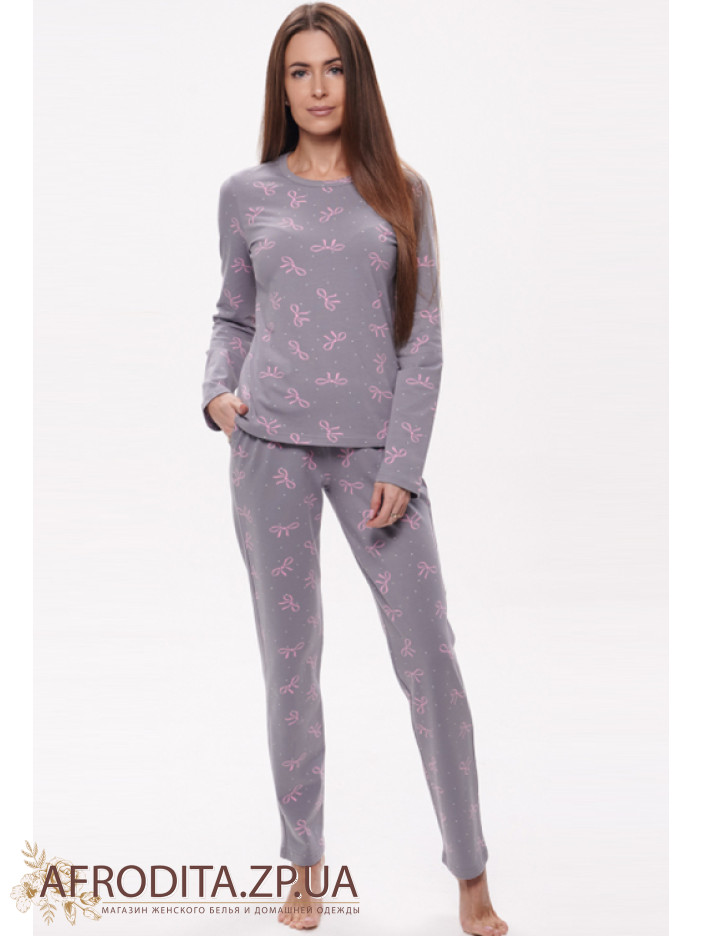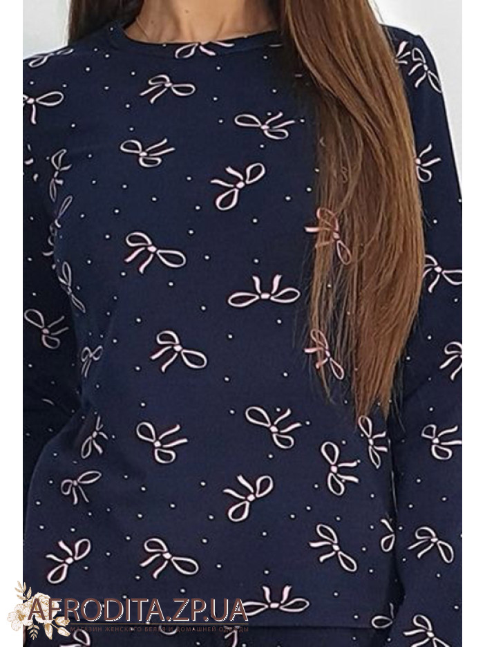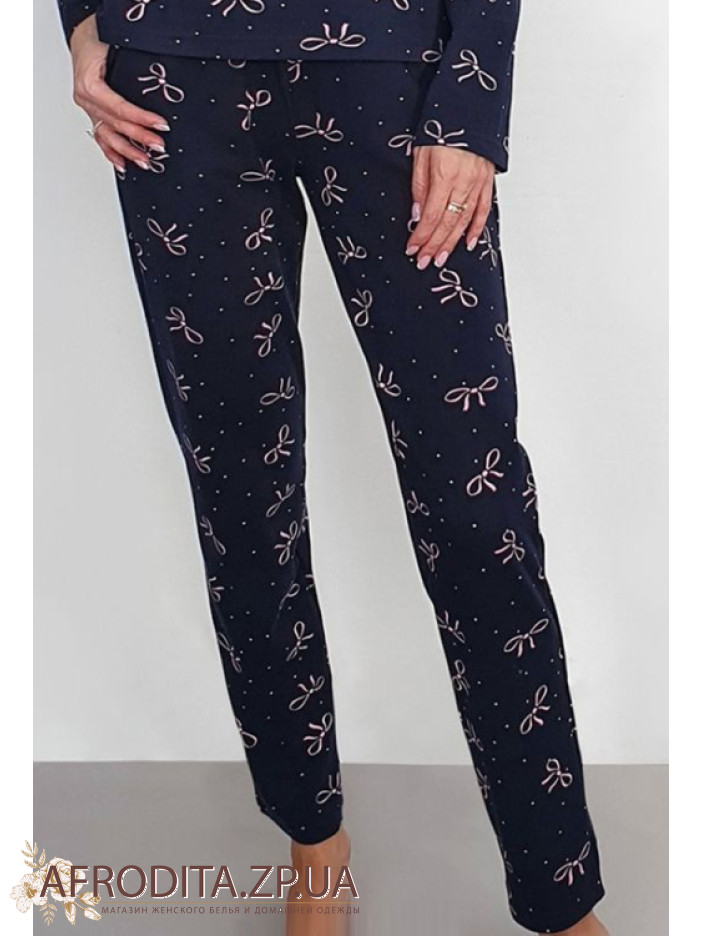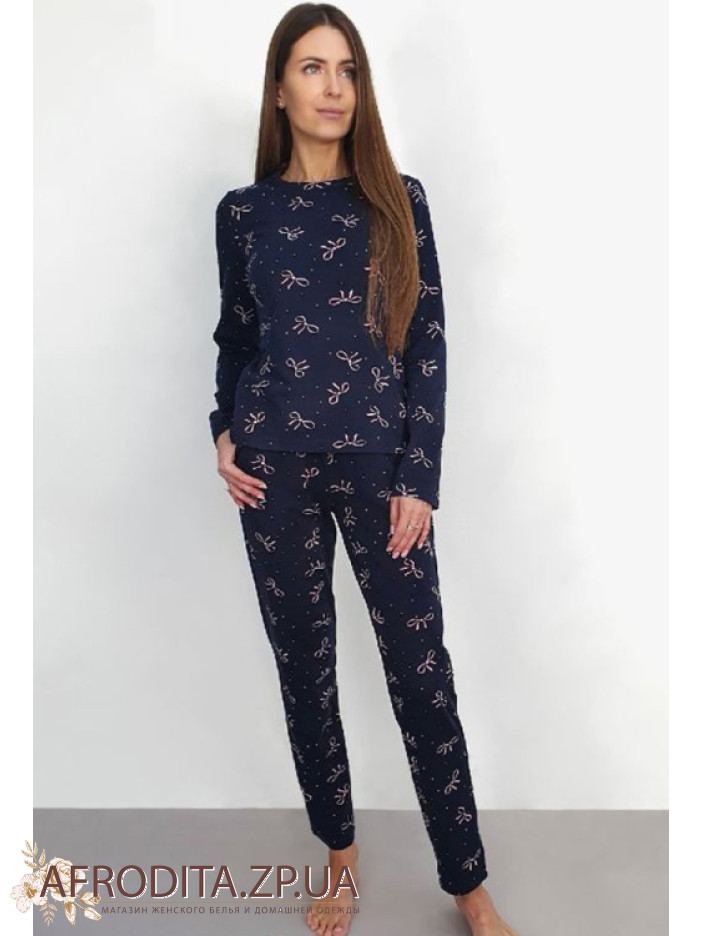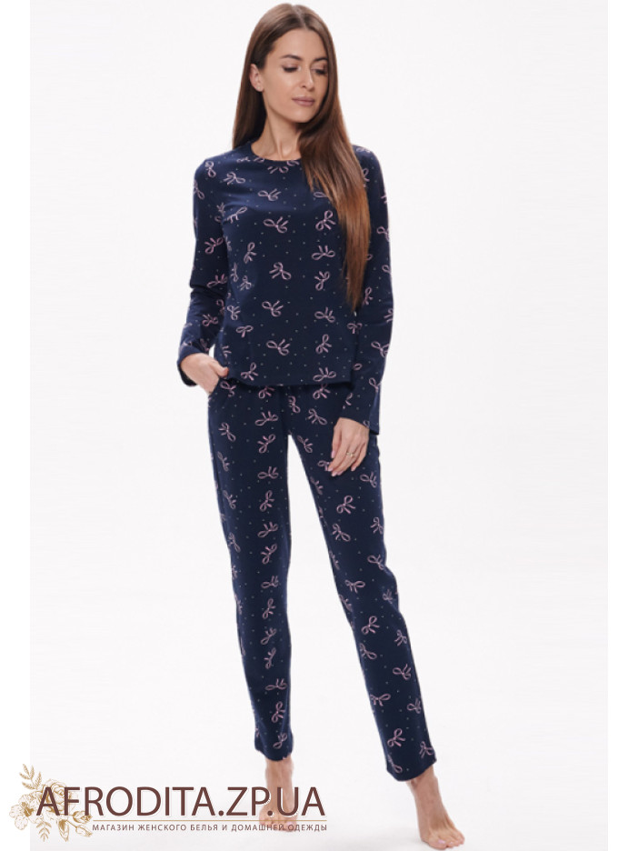 Нежная женская пижама Wiktoria 1703 синий из мягкого натурального хлопка — отличный выбор для комфортного сна и домашнего отдыха. Модель синего цвета с милым принтом в виде розовых бантиков выглядит стильно и уютно. Кофта прямого кроя с длинными рукавами и круглым вырезом дополнена зауженными брюками с мягкой резинкой и удобными боковыми карманами. Практичная и комфортная пижама, которая также станет прекрасным подарком для близкого человека.