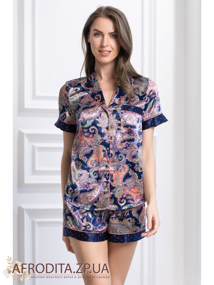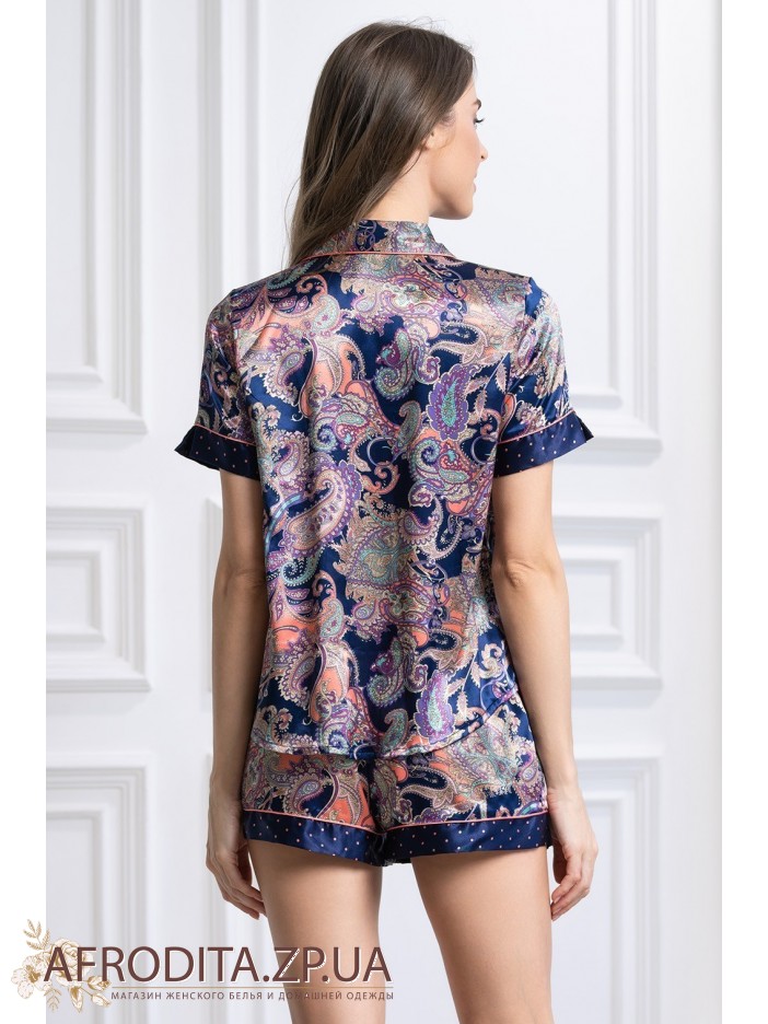 Женская шелковая пижама с фантазийным принтом Эттро 3514 от Mia-Amore изготовленная из натурального шелка. Комплект состоит из рубашки на пуговицах с короткими рукавами, края рукавов декорированы тканью компаньоном, На груди расположен накладной карман Шорты на резинке, нижняя честь изделия также украшен контрастной сканью томно-синего цвета в красный горошек. Комплект выглядит элегантно и может служить хорошим подарком близкому вам человеку.