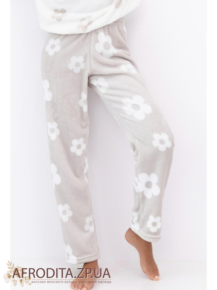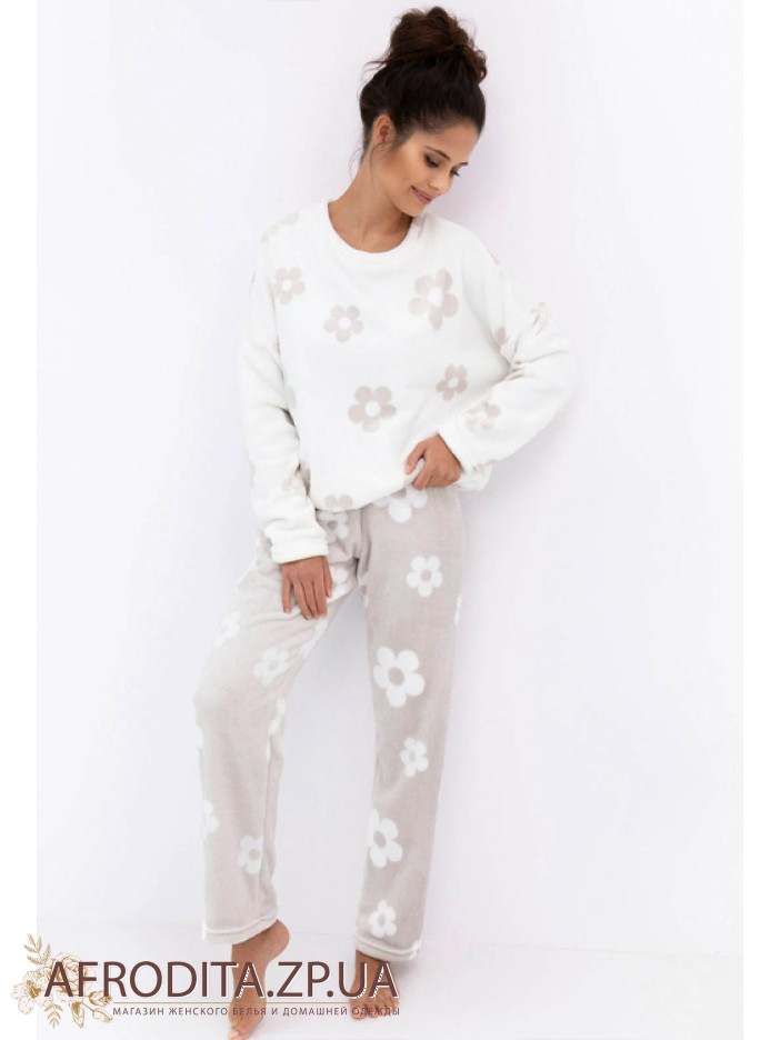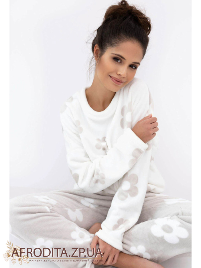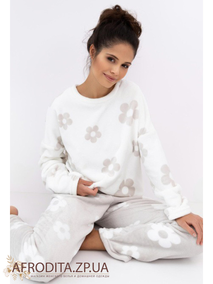 Женская теплая пижама из флиса Sensis 82650 производство Польша. Модель состоит из кофты белого цвета с принтов в виде бежевых цветов. Джемпер свободного кроя с длинными рукавами. Брюки прямого силуета цвета латте с принтом в виде белы цетов. Комплект очень теплый, мягкий и приятный к телу.
