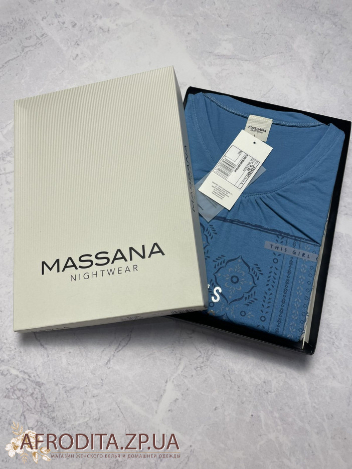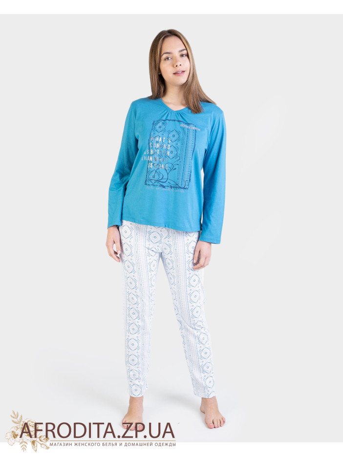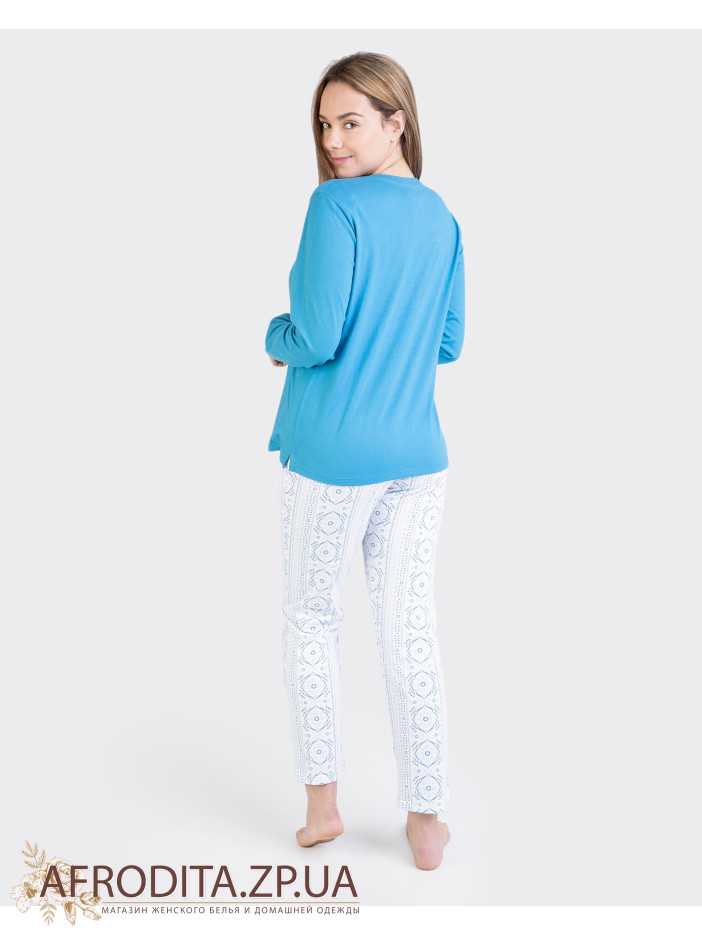 Женская теплая пижама Massana P731280 изготовленная из высококачественного хлопка. Комплект состоит из кофты голубого цвета с длинными рукавами и штаны прямого кроя с цветочным узором.