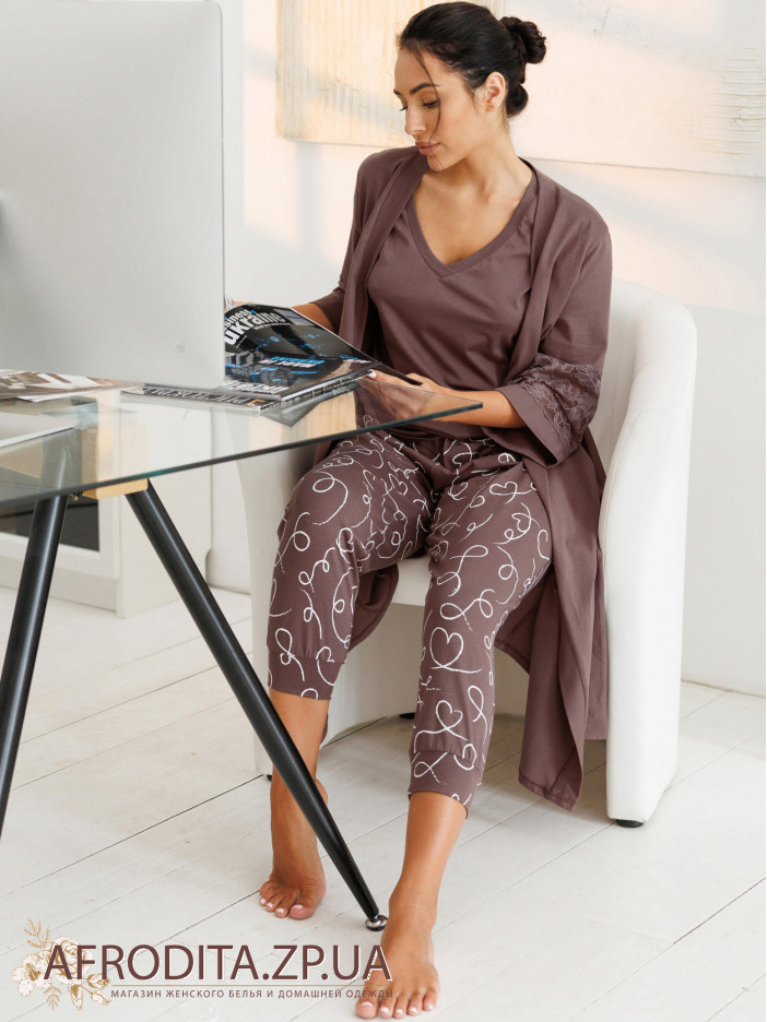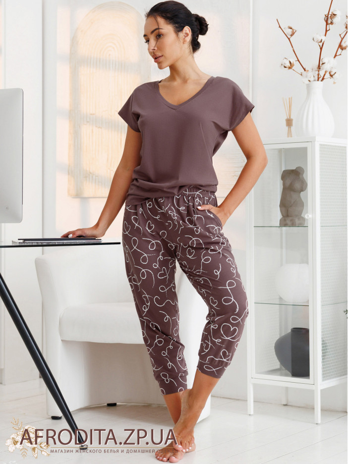 Женские домашний комплект Roksana 82688 изготовленный из высококачественного хлопка. Комплект состоит из однотонной футболки с V- образным вырезом горловины и бридж на реринке, в боковых швах расположены карманы.