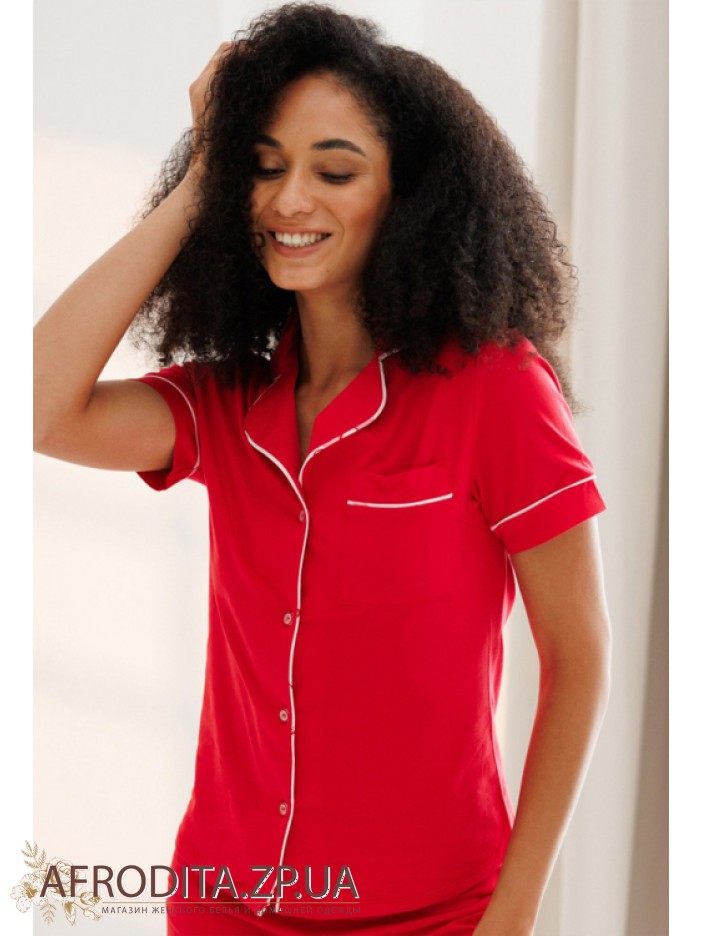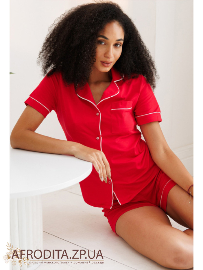 Женский домашний комплект Roksana 82689 от украинской торговой марки Roksana изготовленный из трикотажной ткани на основе хлопка. Пижама состоит из рубашки на пуговицах красного цвета с короткими рукавами. Планка, накладной карман и рукава украшены белым контрастным кантом. Шорты короткие свободного кроя на резинке, низ также декорирован белым кантом.