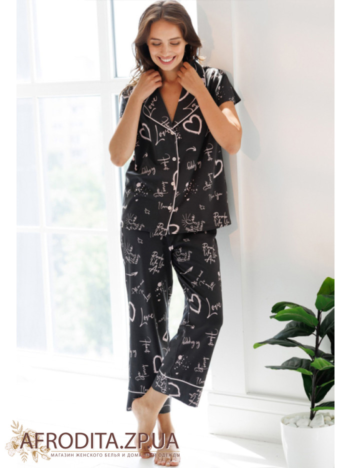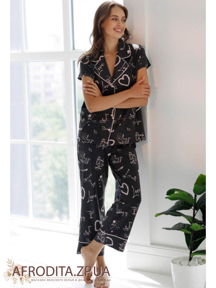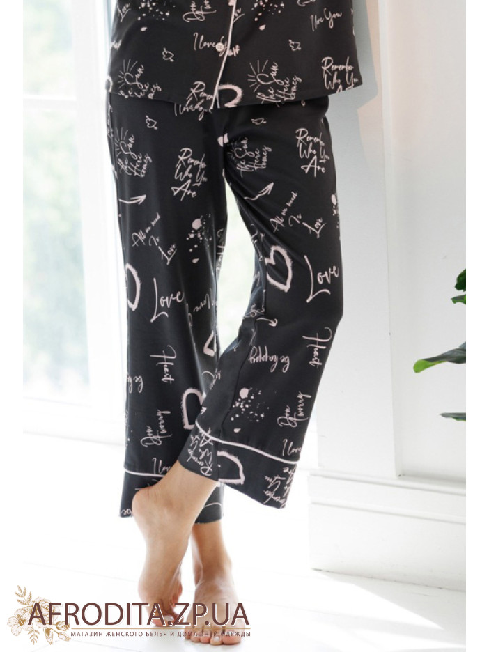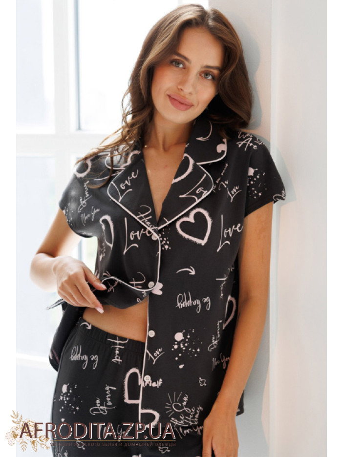 Женский домашний комплект из хлопка Roksana 82711 от украинской торговой марки изготовленный из высококачественного трикотажного полотна. Пижама с оригинальным принтов в виде сердечек и надписью "Love". Пижама состоит из рубашки на пуговицах с короткими рукавами, борт и воротник изделия украшен контрастнім кантом розового цвета.  Брюки на резинке свободного кроя немного укорочены, низ декорирован розовым кантом. Комплент очень комфортный, ткань практичная и приятная к телу. Отличная идея для подарка родственникам или близким вам людям.