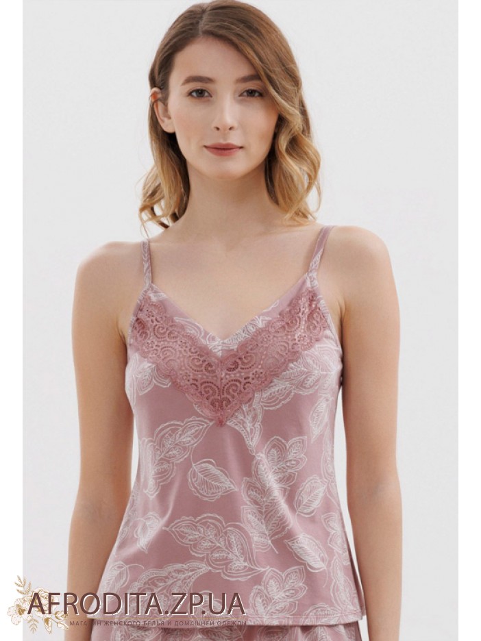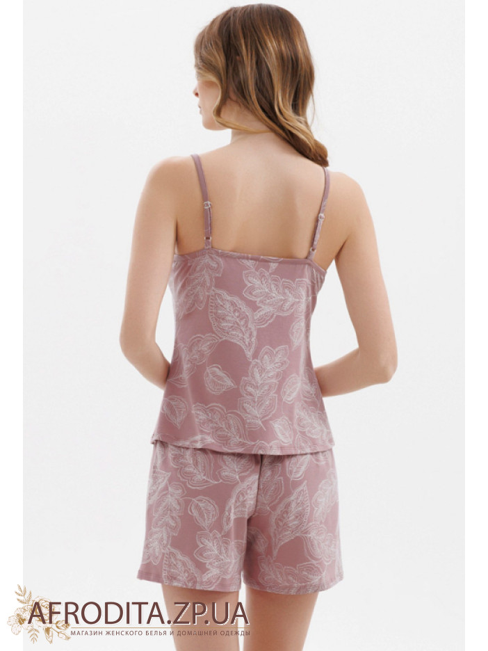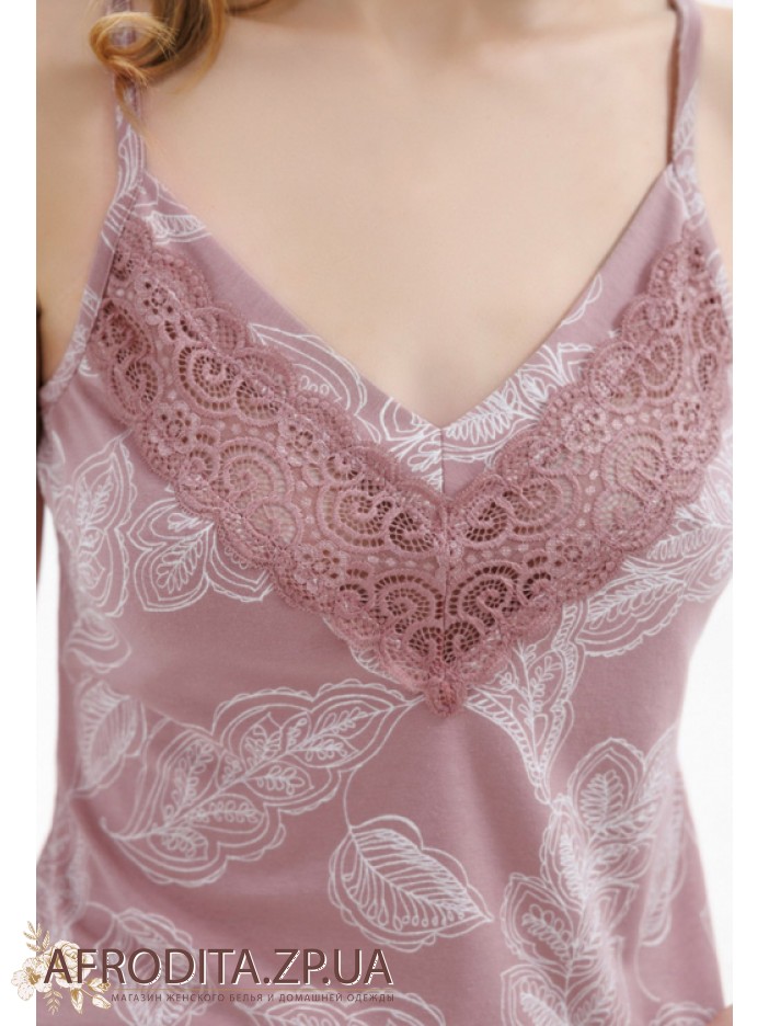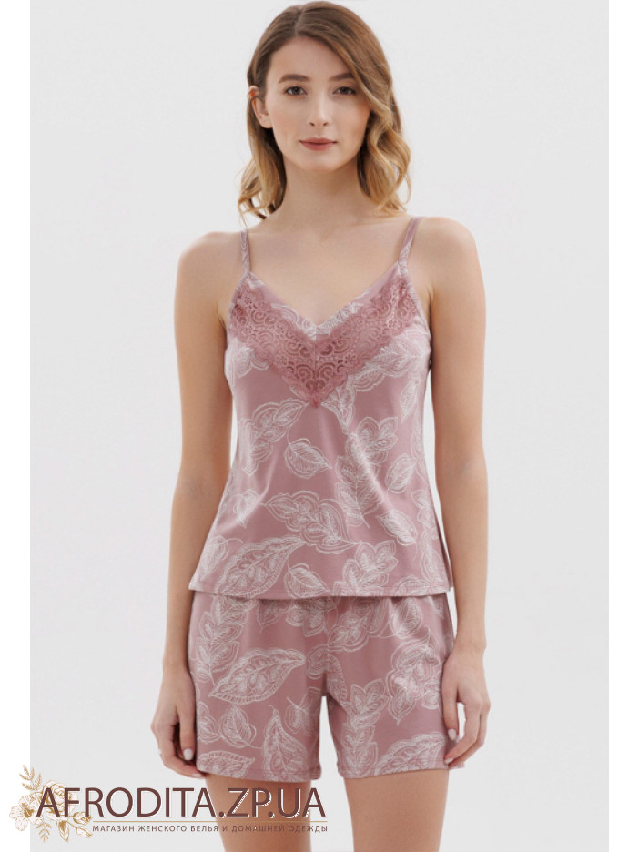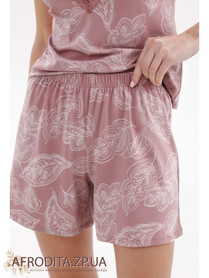 Женский домашний комплект 1788-16531 из трикотажной ткани на основе хлопка от украинского бренда Roksana. Пижама состоит из майки на тонких регулируемых бретелях без подреза под грудью, V-образный вырез декольте декорирован кружевом в цвет изделия. Шорты свободного кроя на резинке на поясе, по бокам расположены карманы.