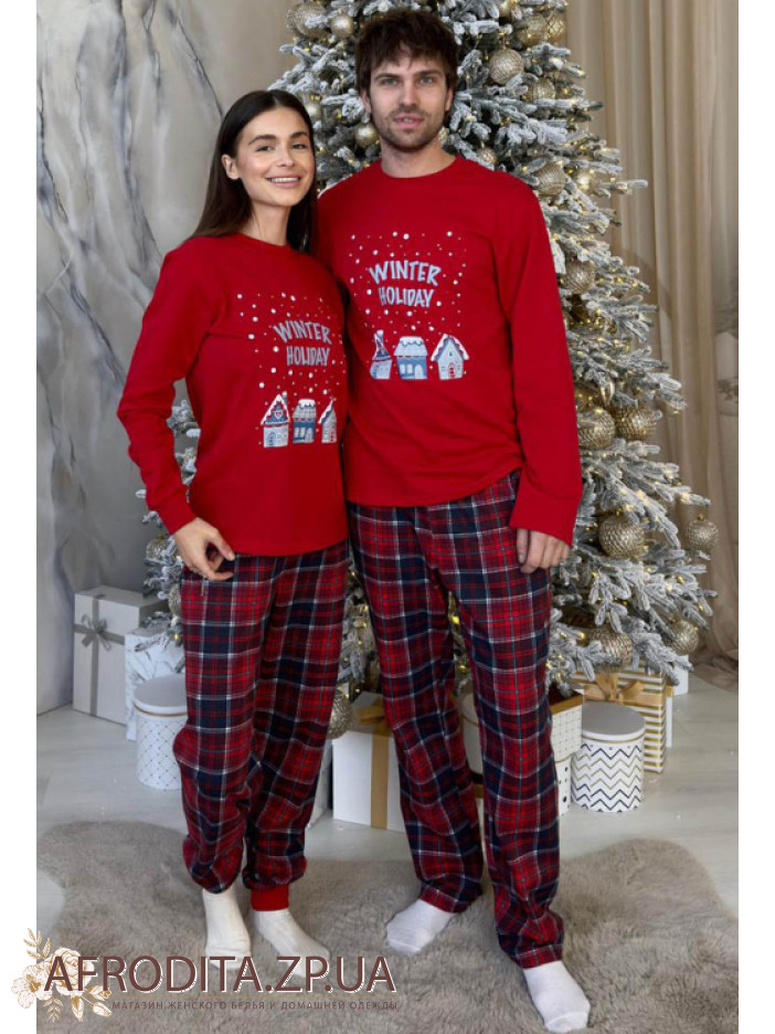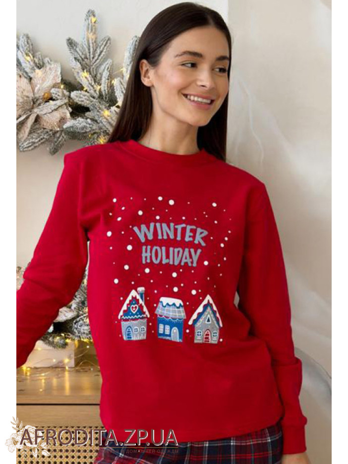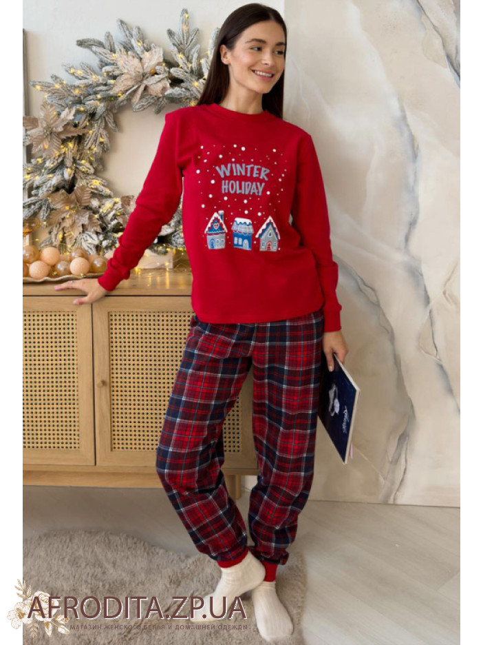 Женский домашний комплект со штанами Cosy 82654 производство Украина. Модель с начесом изготовлена из высококачественного хлопка. Комплект состоит из джемпере красного цвета с новогодним принтом, по центру надпись "winter holiday". Рукав длинный, форма горловины имеет округлую форму. Брюки на резинке свободного кроя  в красную клетку. Пижама очень комфортная и приятная к телу и может послужить отличной идеей для подарка близкому вам человеку.
