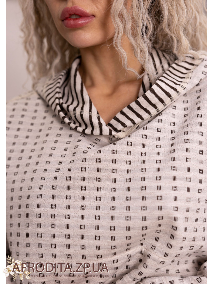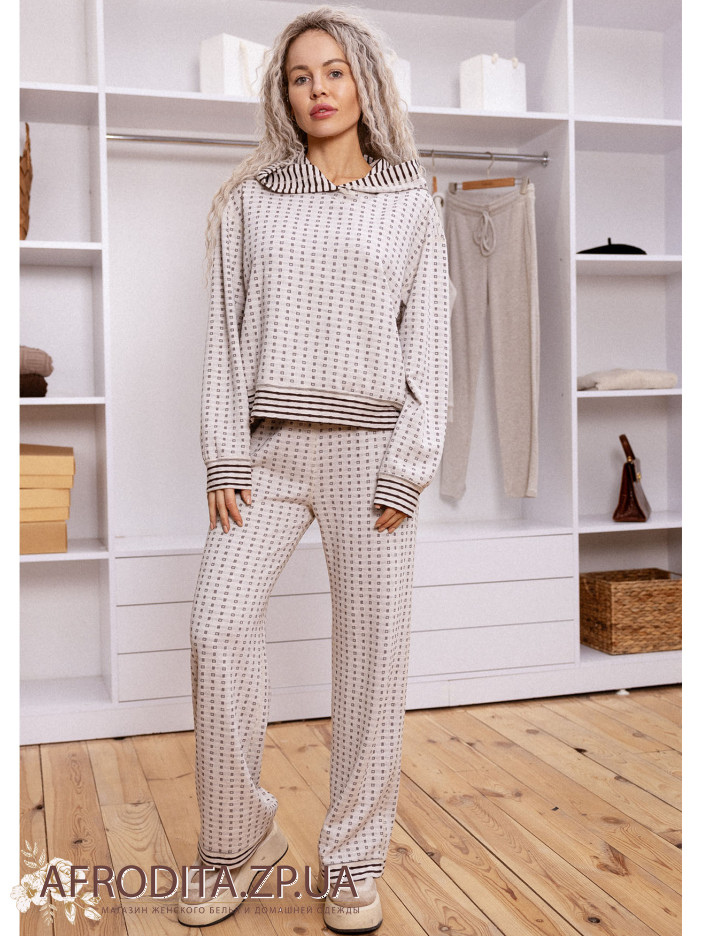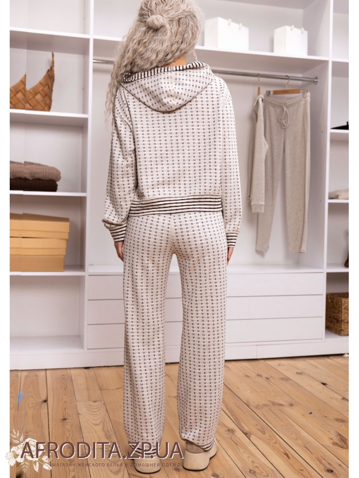 Женский домашний костюм 1621-81013 изготовленный из хлопка и вискозы, ткани очень мягкая и приятная к телу. Комплект состоит из джемпера с длинными рукавами и капюшоном. Манжеты рукавов, воротник декорированы тканью компаньоном в полоску. Штаны на резинке прямого кроя.
