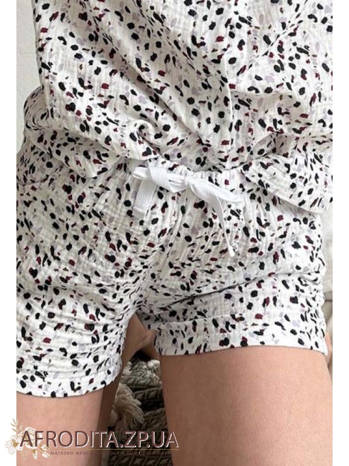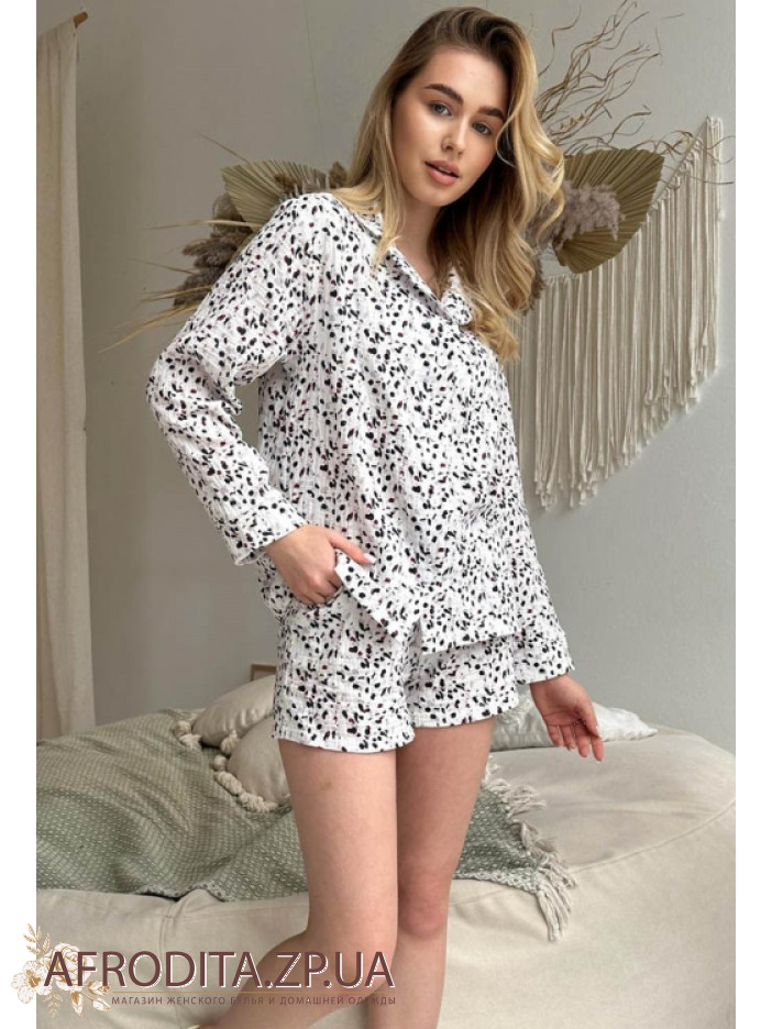 Женский комплект рубашка с шортами из мягкого муслина на основе хлопка. Модель состоит из рубашки на пуговицах свободного кроя, рукав длинный. Шорты короткие на резинке , в шортах есть внутренний шнурок, с помощью которого можно регулировать линию талии. Пижама выглядит очень стиль и хорошо подойдет в качестве подарка близкому вам человеку.