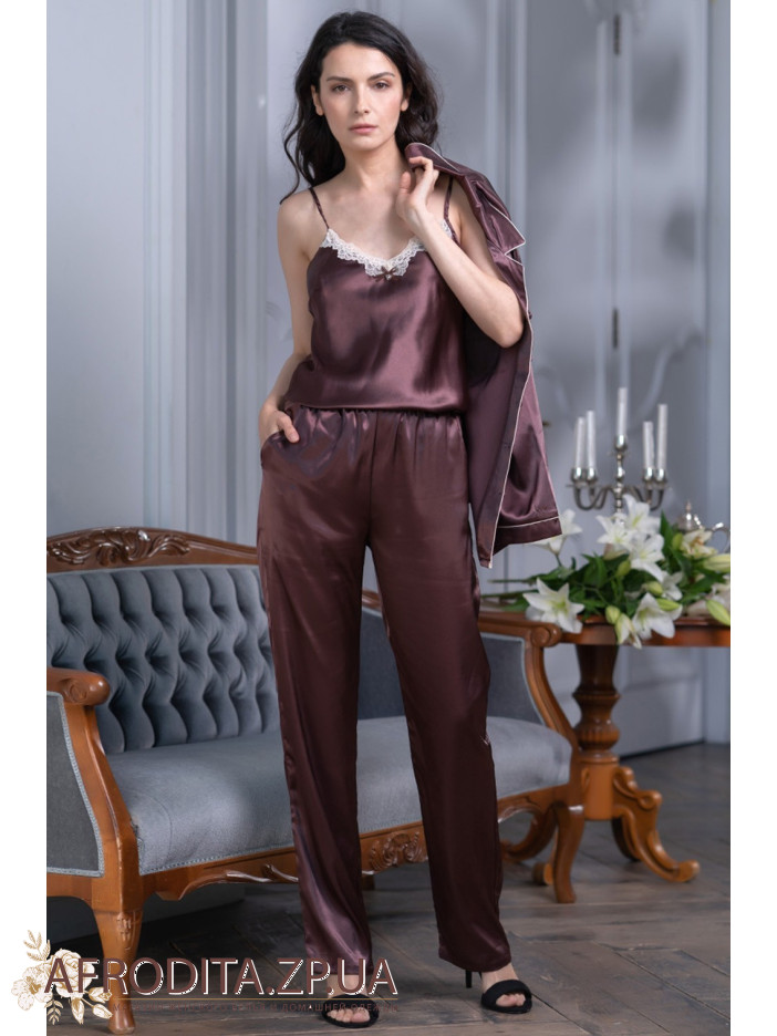 Комплект-тройка Джулия 8735-3 от Mia-Amore состоит из жакета с центральной застежкой на пуговицы c длинными рукавами, топа и брюк. Комплект выполнен из искусственного шелкового полотна с атласным блеском. Рукава, борт, карманы жакета и низ брюк декорированы контрастным кантом.