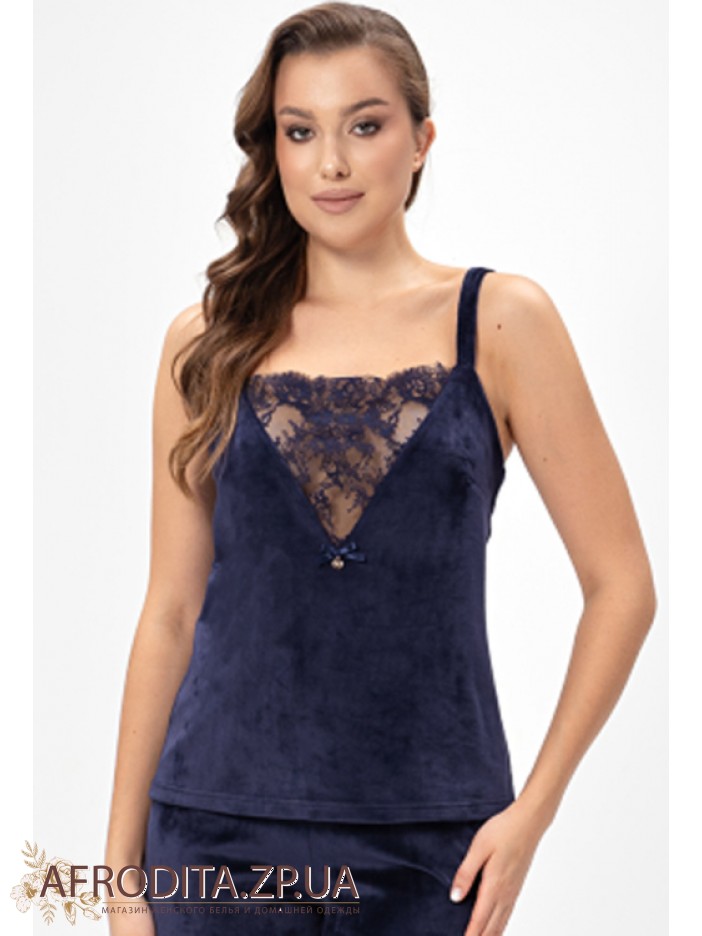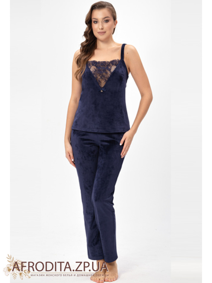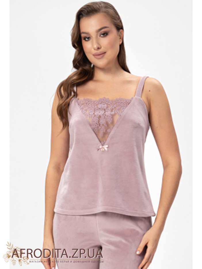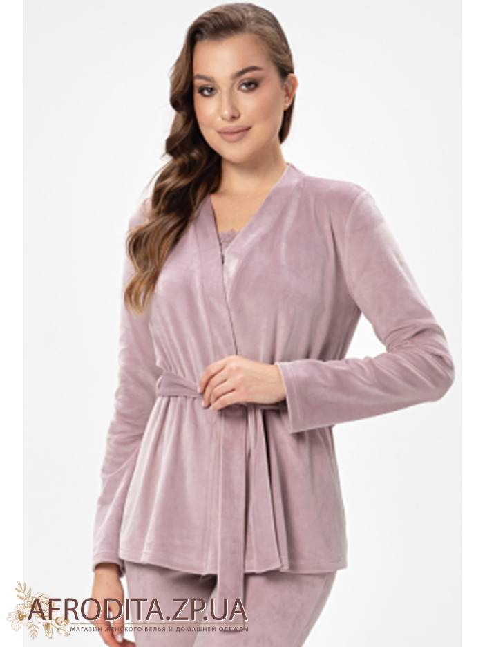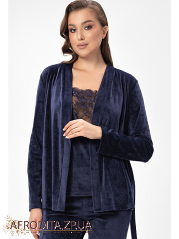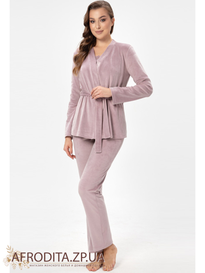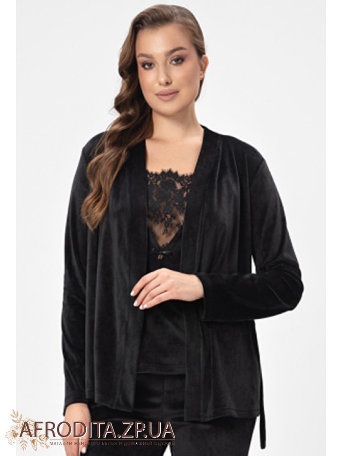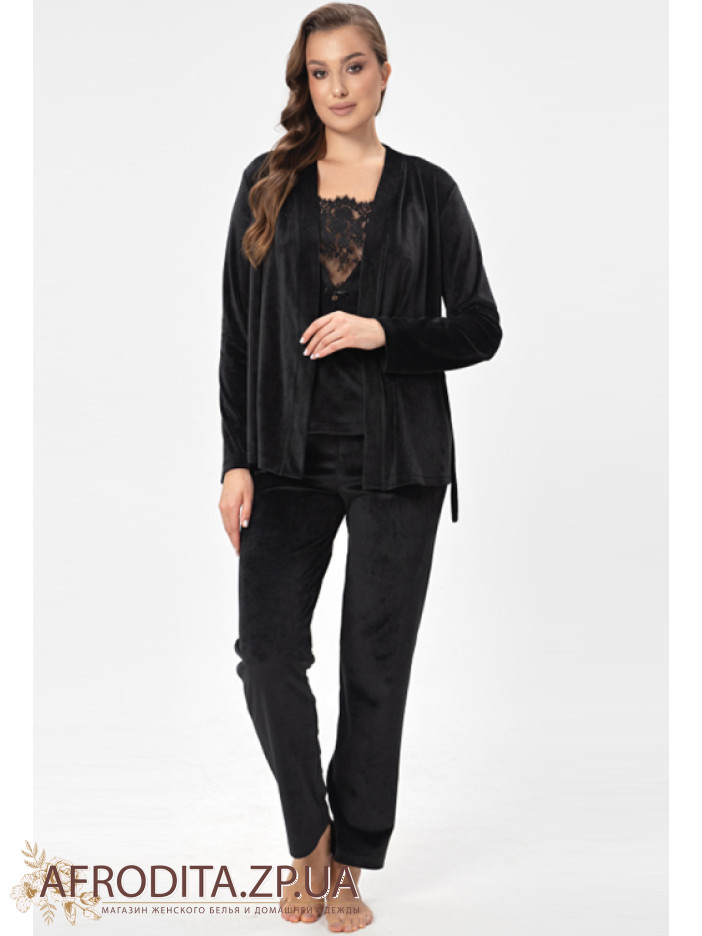Женский комплект тройка Shato 2525 изготовленный из мягкого и приятного к телу велюра. Комплект состоит из майки на тонких регулируемых бретелях, глубокий V-образный вырез декольте украшен кружевной вставкой. Жакет с длинными рукавами на запах, в комплекте есть пояс для регулирования линии талии. Брюки прямого кроя на резинке.