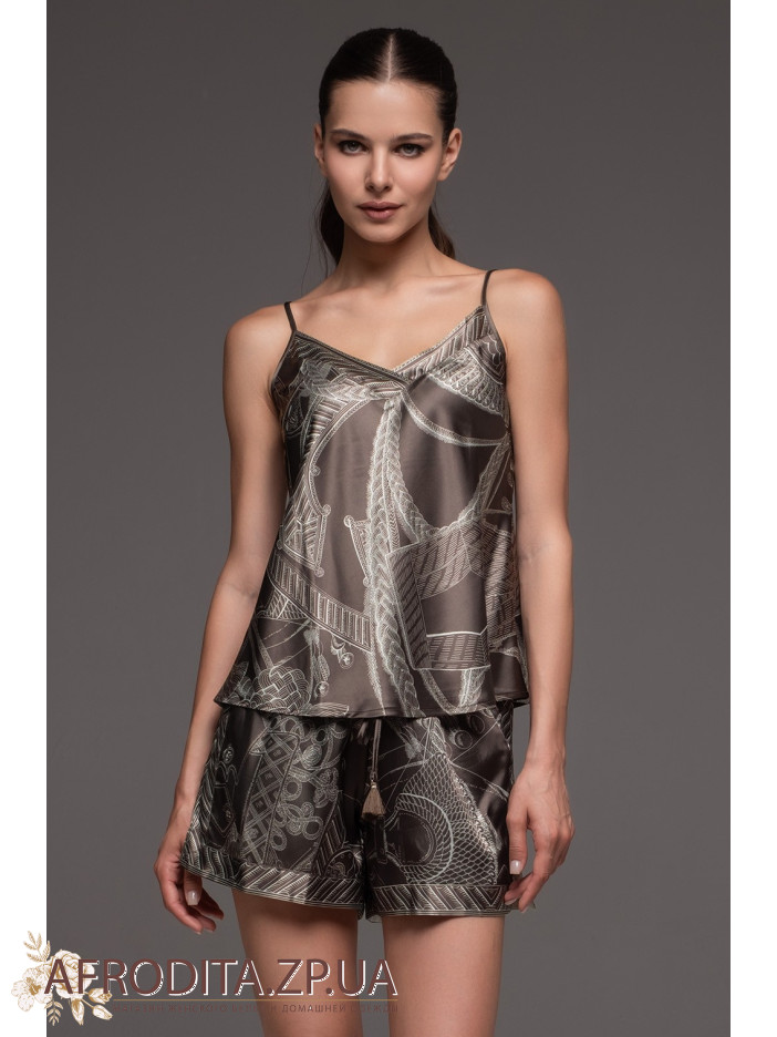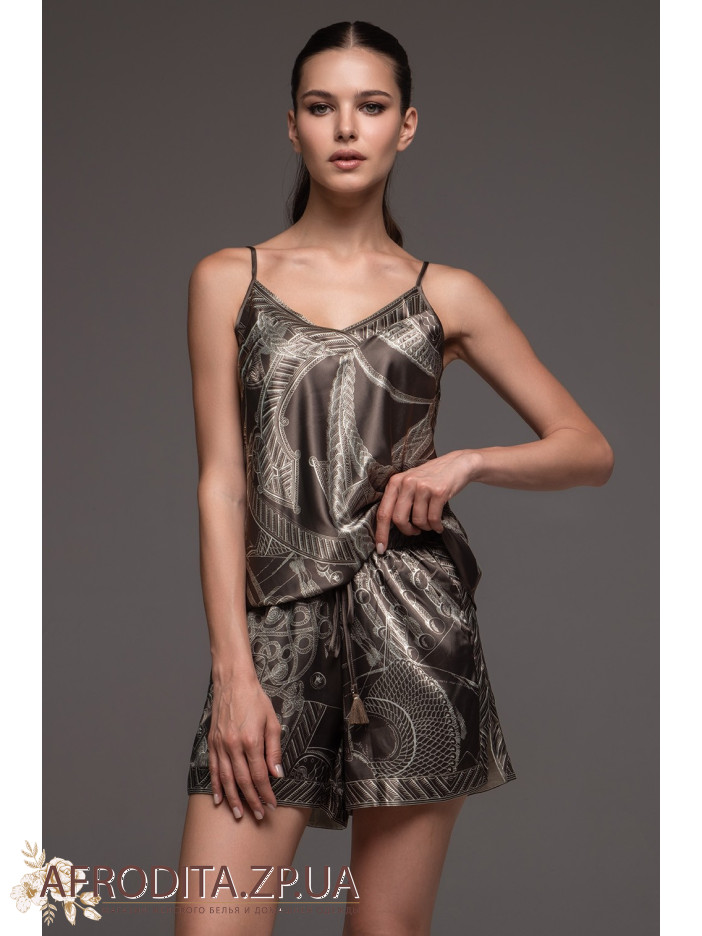 Женский шелковый комплект с шортами Аиша 4312 от Mia-Amore состоит из топа на тонких бретелях и шорт. Изделия комплекта выполнены из принтованного натурального шелка. По бокам шорт обработаны карманы, по низу манжет расположены пикантные разрезы.