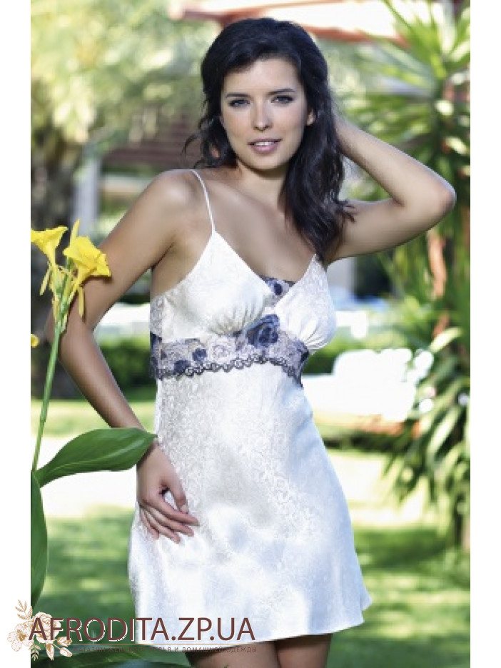 Короткая сорочка из однотонного натурального шелка с жаккардовой основой. Сорочка полуприлегающего силуэта на тонких бретелях. Элегантное многоцветное кружево расположено в центре выреза горловины, а также по линии подреза полочки и спинки. Центр сорочки украшает маленький атласный бантик с серебристым элементом.