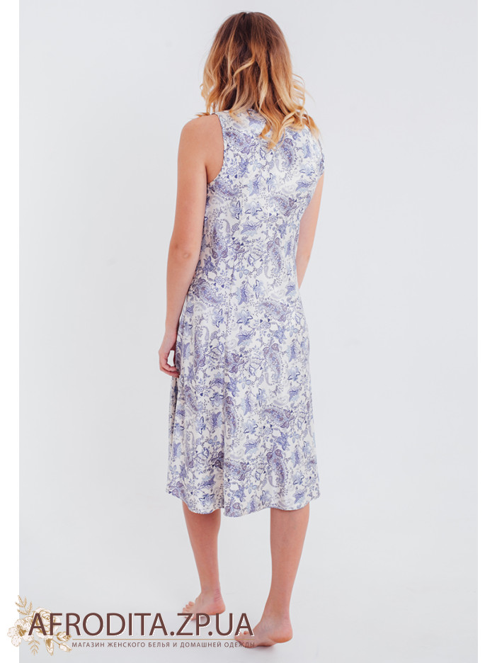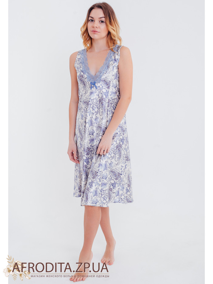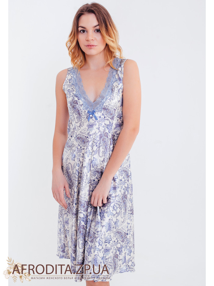 Сорочка для сна "Дольче Вита" 5918 из натурального шелка больших размеров с нежным принтом голубого цвета. Декольте комбинации украшено кружевом.