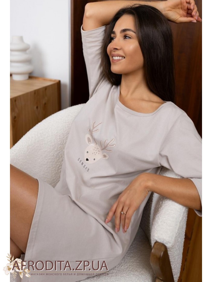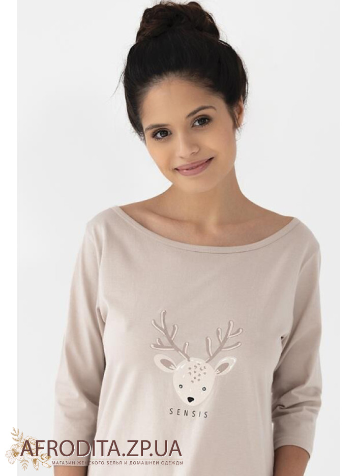 Домашняя женская туника Sensis Gaia изготовленная из хлопка. Туника выше колен с рукавом 3/4, по средине изображен маленький олененок.