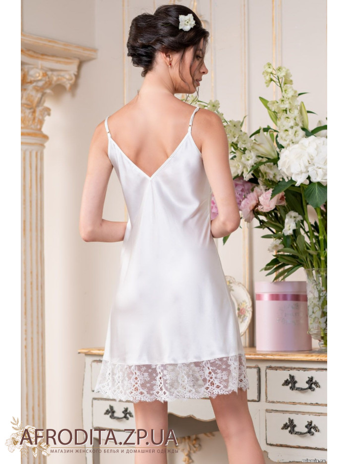 Изящная короткая сорочка Эдита 3670 от Mia-Amore на тонких бретелях с V-образным вырезом на спине, выполнена из смесового однотонного шелка. Вырез полочки и низ обработаны французским кружевом. Декор - атласный бантик с искрящейся подвеской, расположенный по центру выреза сорочки.