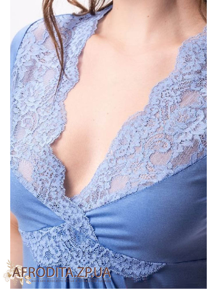 Очаровательная ночная сорочка Shato с мягкой голубой вискозы сочетает комфорт и женственность. Полуприлегающий силуэт и длина выше колен красиво подчеркивают фигуру, а V-образный вырез и отрезной лиф создают изящную линию декольте. Широкие вставки из ажурного кружева по вырезу и под грудью придают образу утонченности. Идеальный выбор для комфортного сна и стильный подарок для близких.