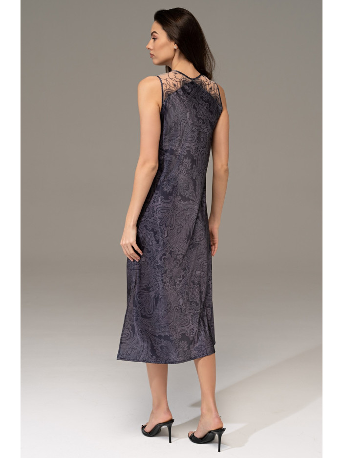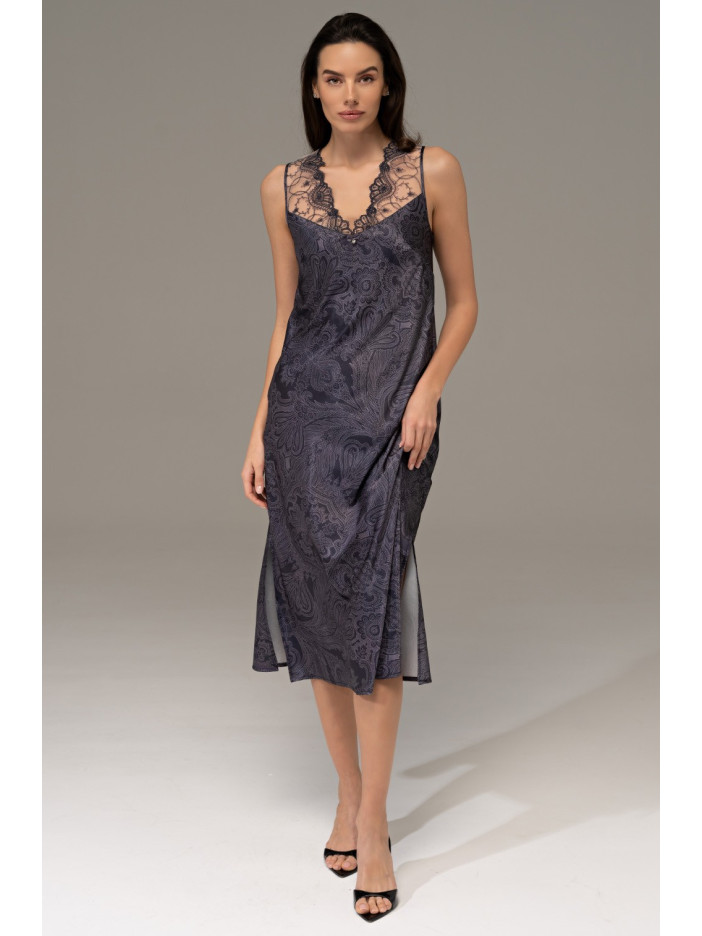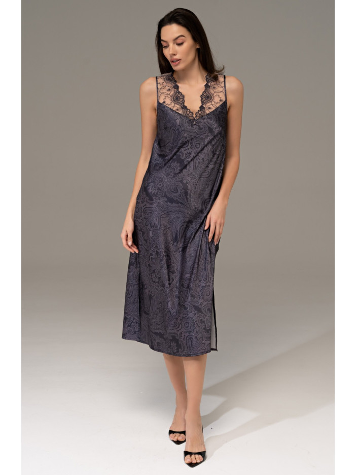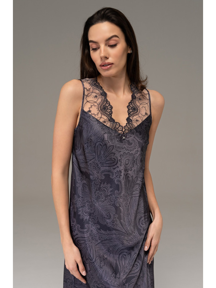 Элегантная длинная сорочка Алетта 4448 от итальянсого бренда Mia-Amore полуприлегающего силуэта на широких бретелях, без подреза под грудью, выполнена из принтованного смесового шелка в благородном цвете графит. Изделие дополнено ажурным кружевом по верху изделия. Декор - маленький атласный бантик с подвеской по центру выреза сорочки. По низу расположены разрезы для свободы движения. Данную модель можно укомплектовать с длинным халатом Алетта 4449.