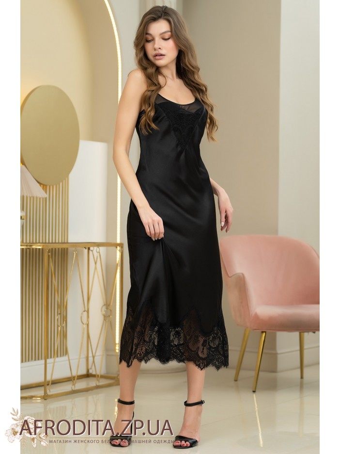Длинная изящная сорочка Эстер 7294 от Mia-Amore на тонких бретелях без подреза под грудью, выполнена из однотонного искусственного атласного шелка с широкой кружевной частью по низу, и V-образной кружевной вставкой по вырезу сорочки.