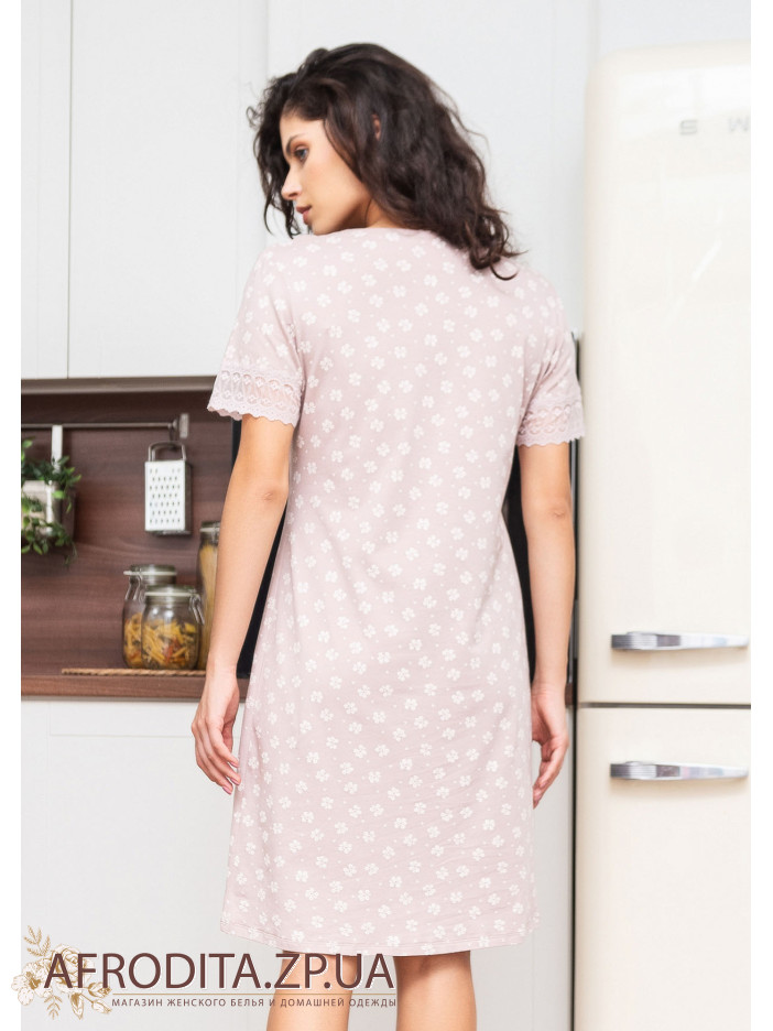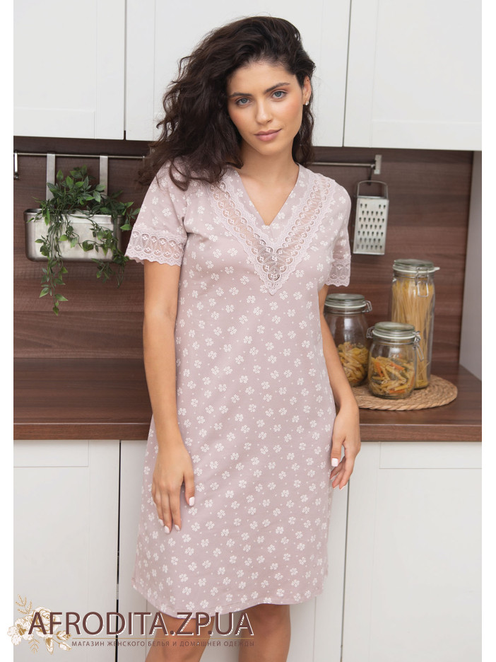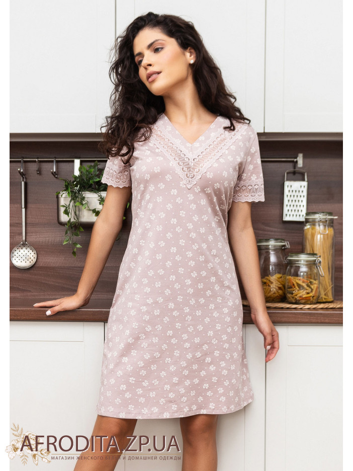 Женская ночная сорочка 1174-16051 из хлопка очень приятной расцветки кофе с молоком. Сорочка средней длинны с коротким рукавом. V-образный вырез в области декольте украшен кружевными вставками. Края рукавов также декорированы ажурным кружевом.