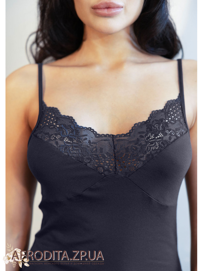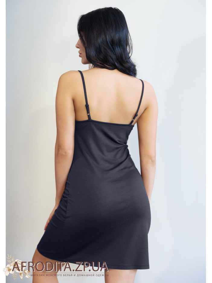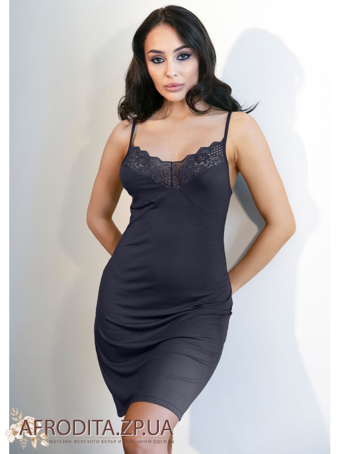 Женская ночная сорочка Roksana 82793 черного цвета изготовленная из вискозы. Сорочка выше колен без подреза под грудью, бретели тонкие и регулируются. Область дкольте украшена кружевом.