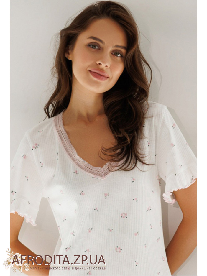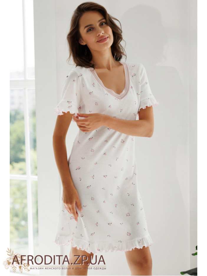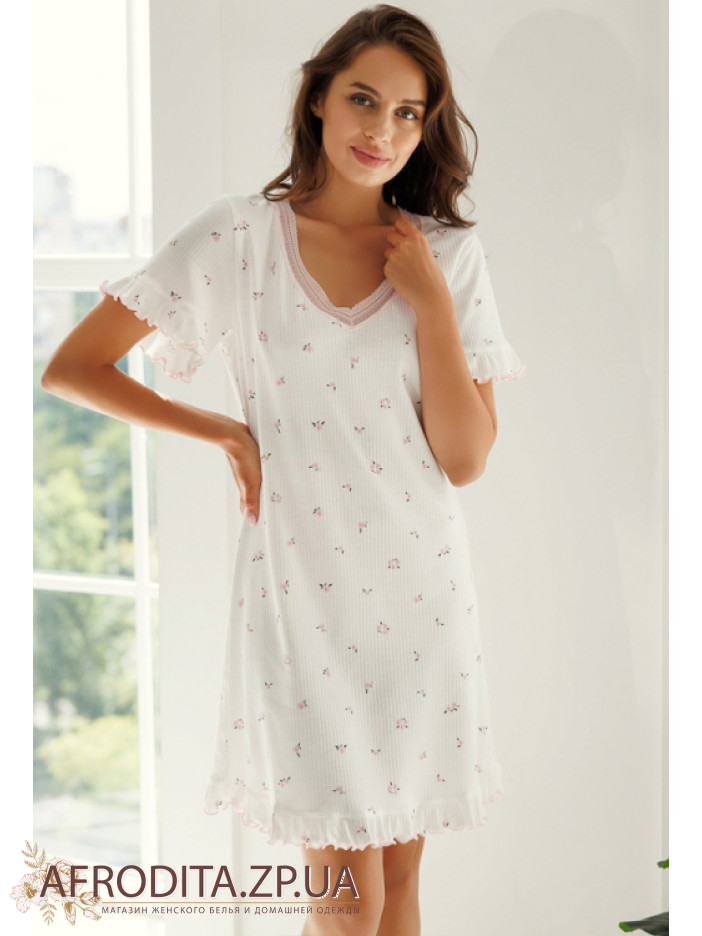 Очаровательная женская ночнушка из коллекции Розквитай от украинского бренда Roksana. Ночнушка выполнена из мягкого и качественного хлопка в рубчик, белого цвета с принтом в виде нежных розовых цветочков, с короткими рукавами и V-образным вырезом горла. Модель свободного силуэта и длиной выше колен выглядит аккуратно и одновременно комфортно. Горловина изделия украшена вставками из ажурного кружева розового цвета, рукава и низ обработаны игривыми рюшами и волнистой отделкой. Ночнушка очень красивая и комфортная, идеальна для сна и домашнего отдыха, когда хочется остаться в чем-то легком и удобном, также подойдет для подарка близкому человеку.