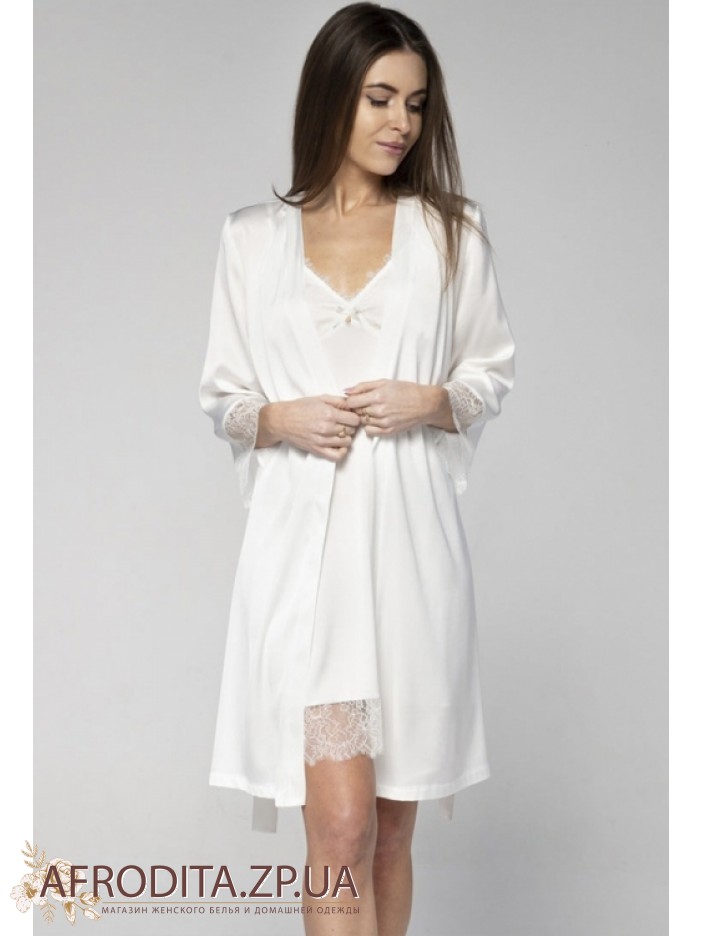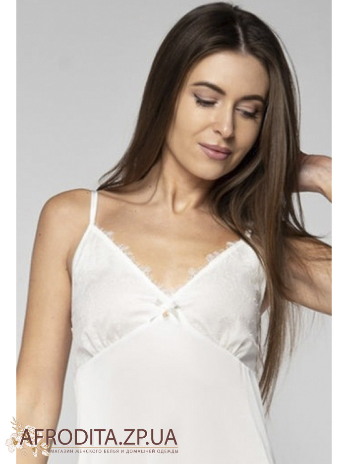 Женская ночная сорочка Shato 2210 из атласного и очень мягкого шелка Армани. Сорочка выше колен с подрезом под грудью, длинна бретелей регулируется. V-образный вырез декольте и низ изделия декорирован кружевом.