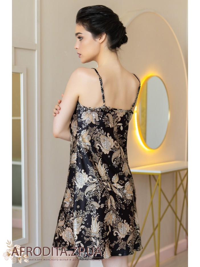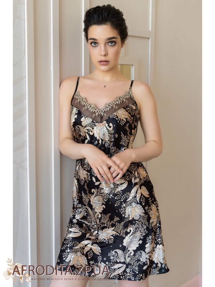 Женская ночная сорочка Ясмина 3981 от Mia-Amore без подреза на тонких бретелях выполнена из принтованного смесового шёлка. Лиф сорочки украшает широкое вышивное кружево. По центру лифа сорочки бантик с подвеской.