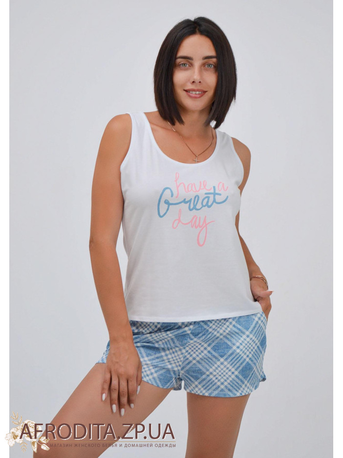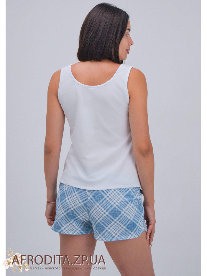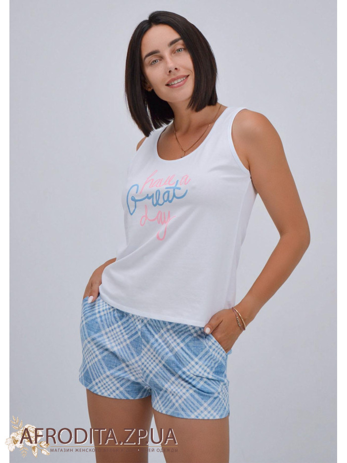 Пижама женская из хлопка 708-16981. Комплект состоит из однотонной майки белого цвета на широких бретелях, по центру майки надпись. Короткие шорты голубого цвета на резинке, по бокам есть карманы.