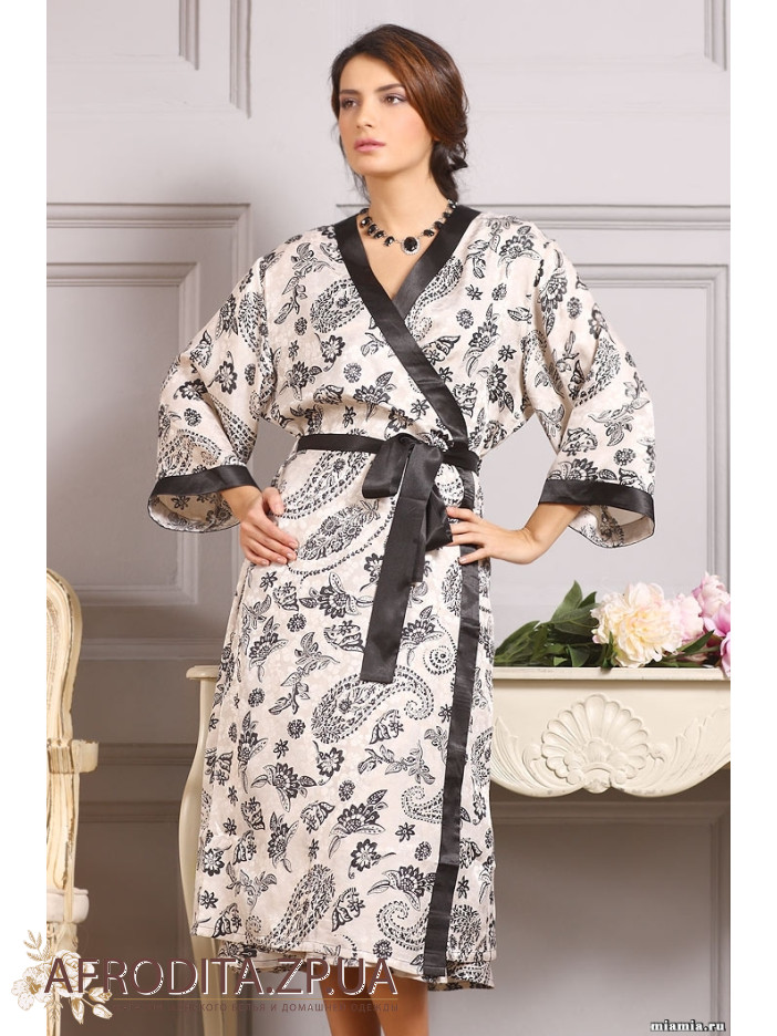 Длиный классический халат-кимоно из принтованного искуственного шелка с жаккардовой основой.Принт кимоно в восточном стиле-персидскими огурцами. Пояс халата, борта и низ рукавов выполнены из черного атласа.