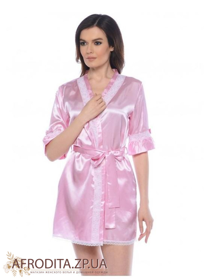 Короткий халат "Классик" 17053 прямого силуэта с втачным рукавом и фигурными боковыми карманами из искусственного однотонного шелка. Низ модели декорирован узким кружевом. Горловина и борта халата, а также рукав декорированы широким кружевом и бантиками. Халат на запах с поясом.