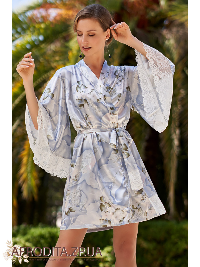 Роскошный короткий халат из коллекции "Новелла" 3603 от Mia-Amore с широкими расклешенными рукавами выполнен из принтованного смесового шелкового полотна. Низ рукавов декорирован широкой кружевной полосой. Линию украшают тонкие контрастные канты. Халат на запахе с поясом, в боковых швах есть карманы.Состав 70% натуральный шелк, 25% полиэстер, 5% эластан