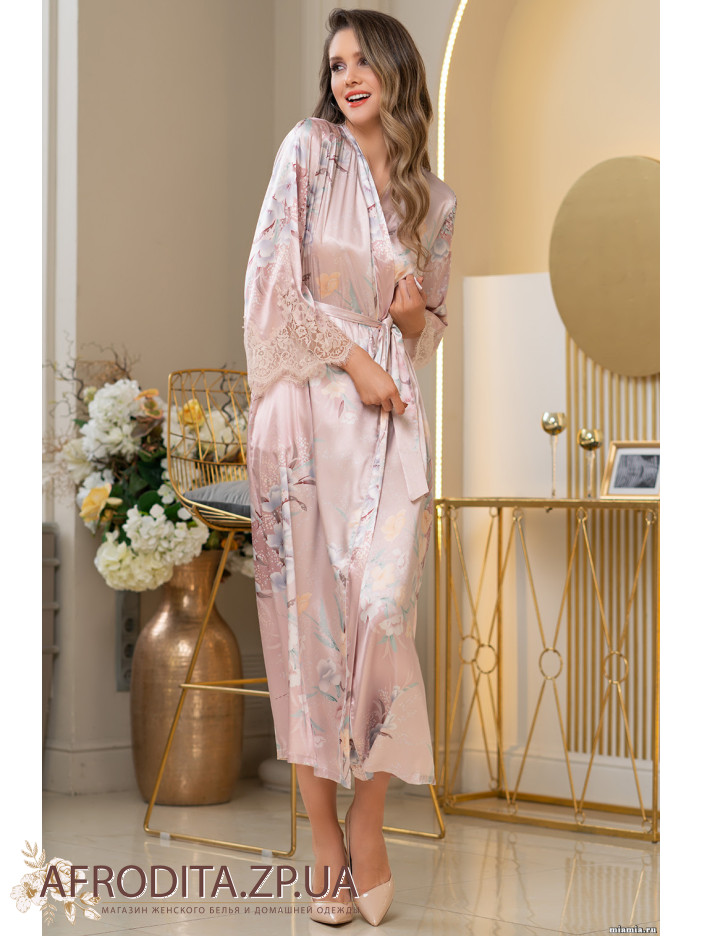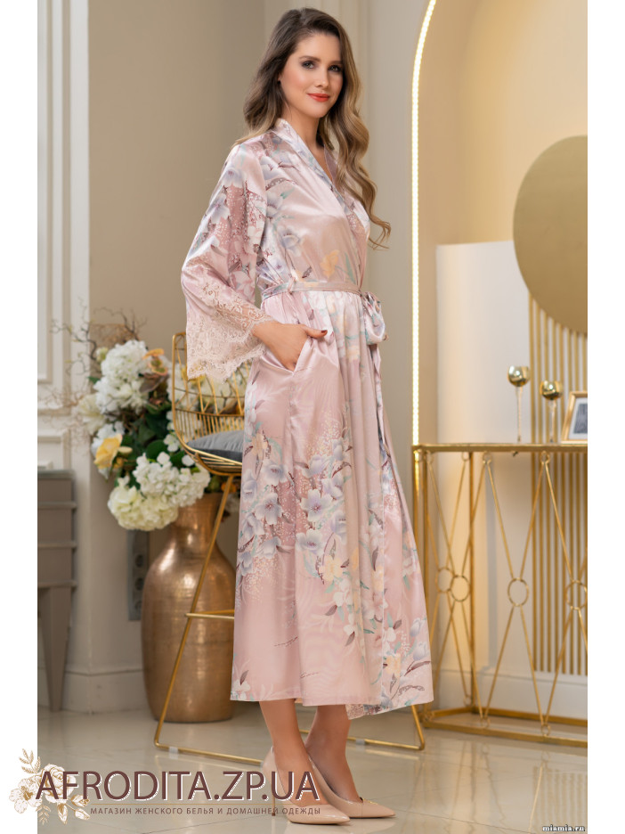 Длинный классический запашной халат Mia-Amore с рукавом длиной 7/8, выполнен из принтованного смесового шелка и декорирован ажурным кружевом, которое расположено по низу рукавов. Контрастный кант подчеркивает линию борта. По бокам обработаны карманы.