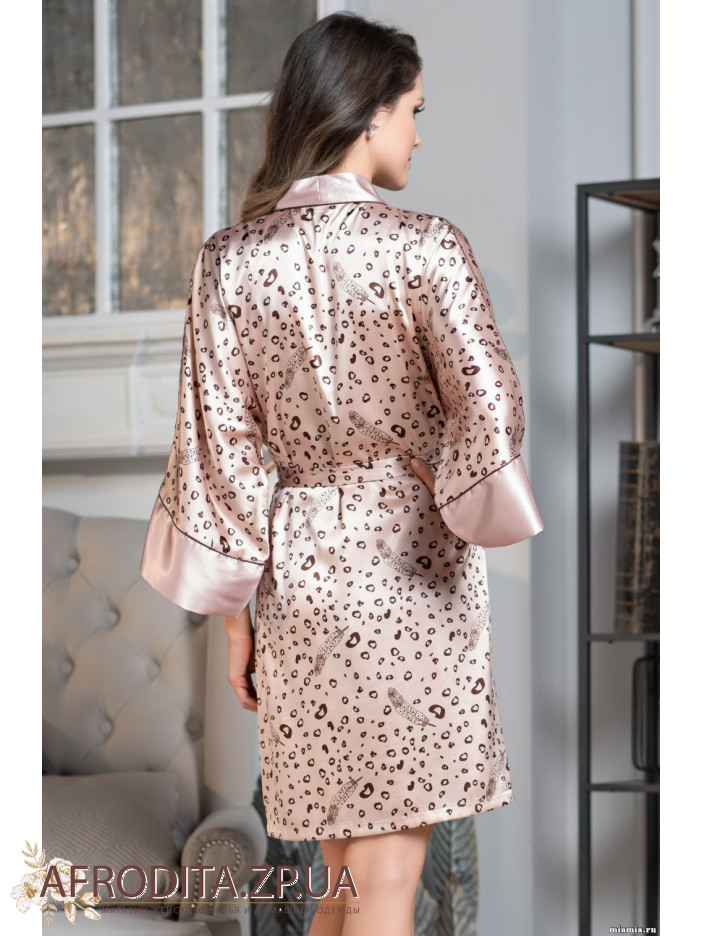 Короткий халат-кимоно Mia-Amore с широким рукавом, выполнен из принтованного искусственного шелка с блеском и однотонной отделкой по бортам и низу рукавов. В боковых швах обработаны карманы.