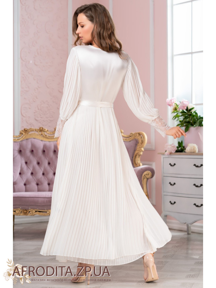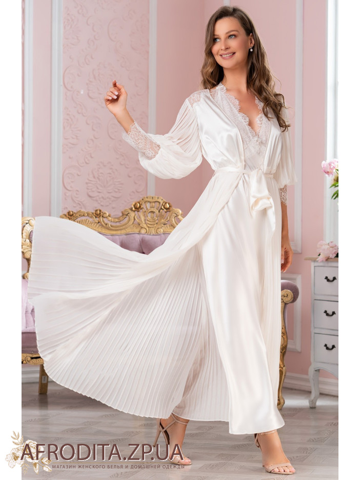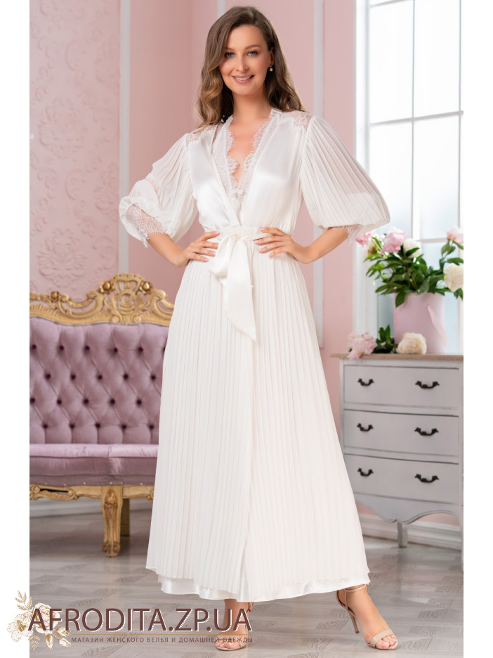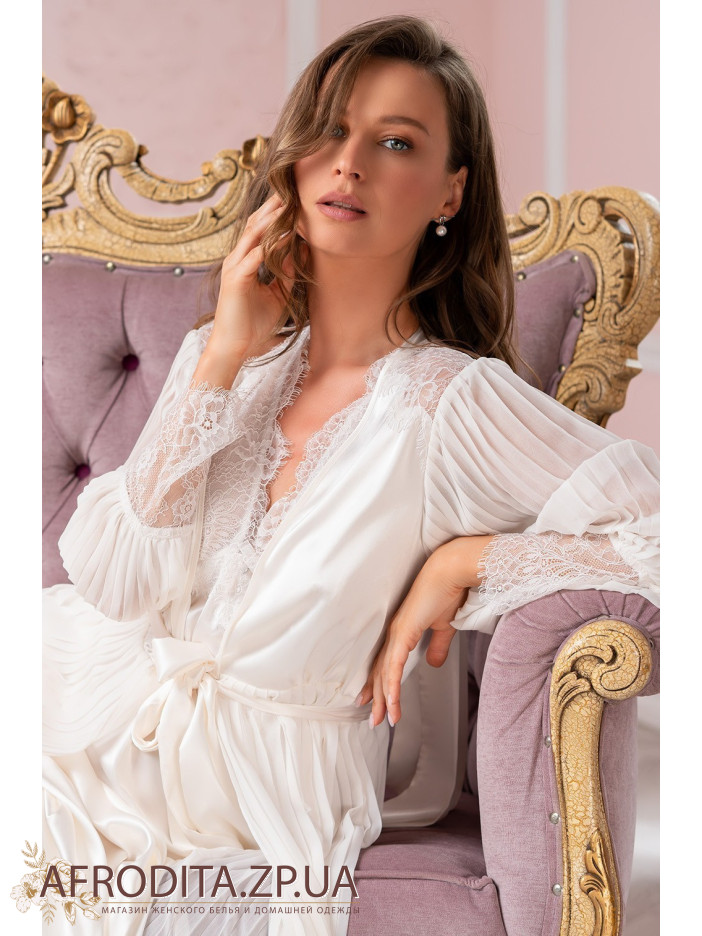 Длинный пеньюар "Шартрез" 7029 Mia-Amore из атласного полотна выполнен в сочетании с тонким кружевом и шифоном-плиссе. Халат может стать как дополнительный предметом к вечернему образу, так и самостоятельной единицей. Идеально будет сочетаться с короткими и длинными сорочками. Легкость пеньюару придают шифоновые рукава и струящийся плиссированный низ.