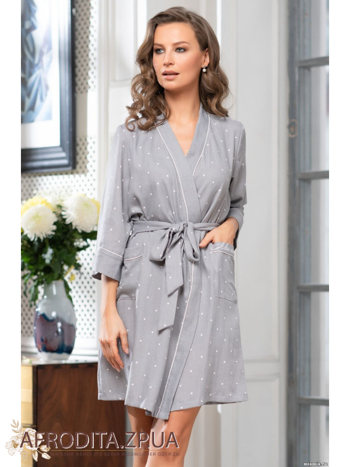 Запашной халат Mia-Mella с рукавом длиною 3/4. Выполнен из тканой принтованной вискозы с отделкой в виде контрастных кантов. На полочках обработаны накладные карманы.Состав 75% вискоза, 25% полиэстер