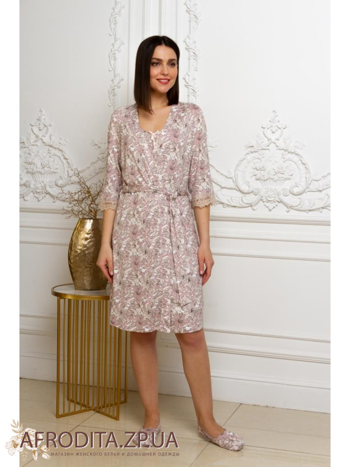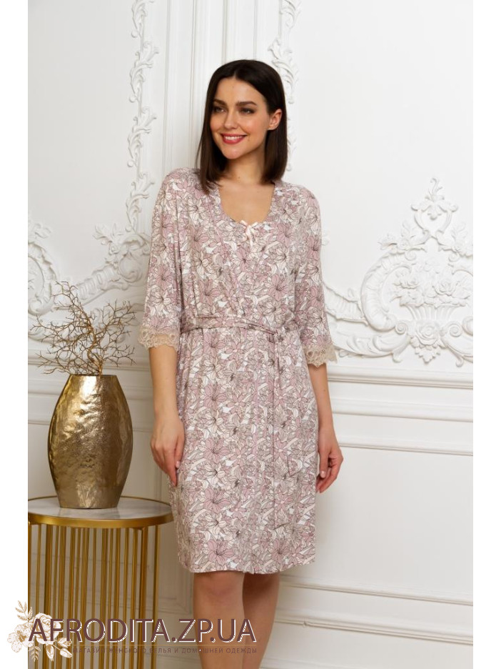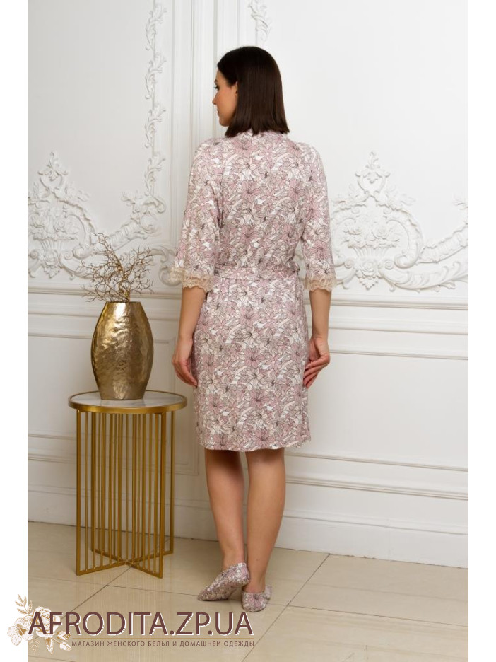 Халат женский на запах "Emmi" 78122 изготовлен из высококачественного вискозного полотна с добавлением эластана. Халат до колен, рукав выполнен в 3/4,края рукавов украшены кружевом. В комплекте прилагается пояс.
