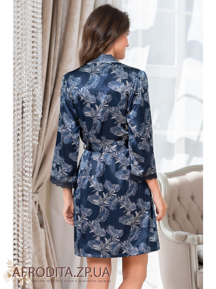 Короткий запашной халат Mia-Amore с широким длинным рукавом, выполнен из принтованного смесового шелка с отделкой тканью компаньоном и контрастным кантом. Края рукавов обработаны узким кружевом. По бокам расположены карманы.