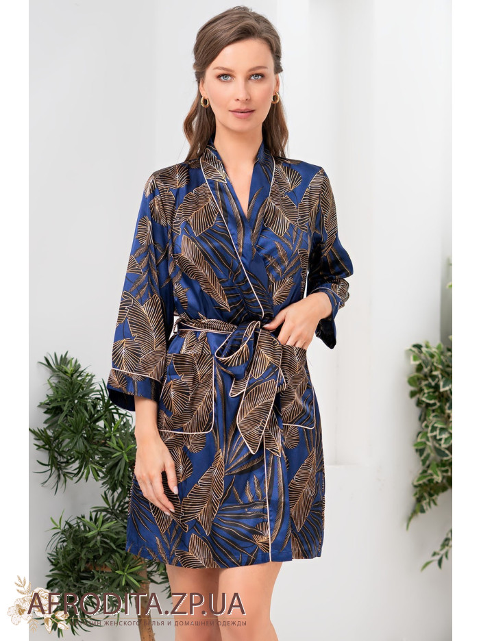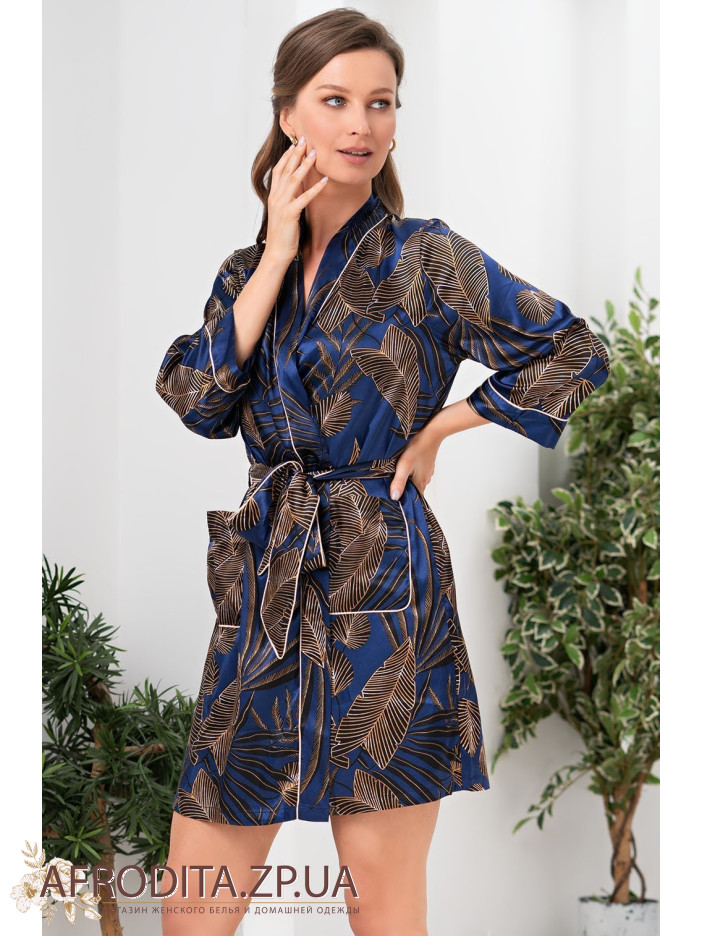 Короткий запашной халат Mia-Amore выполнен из принтованного искусственного шелка. Планка, обтачка рукавов, накладные карманы и пояс декорированы золотым кантом.