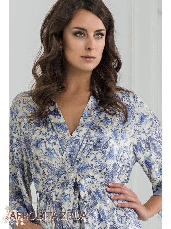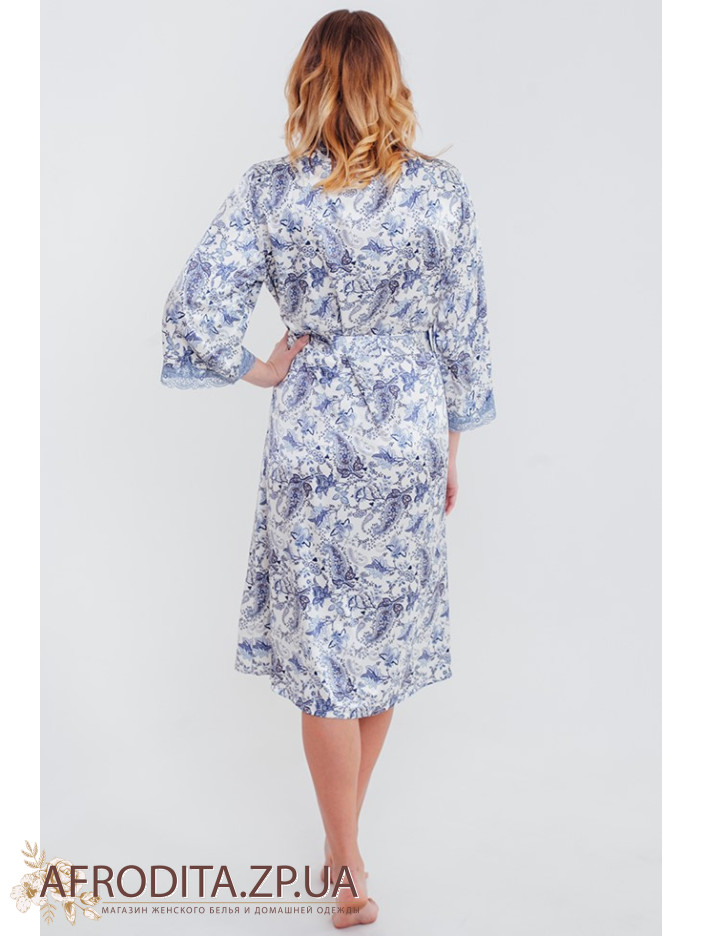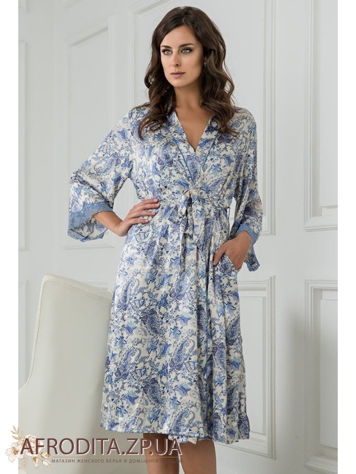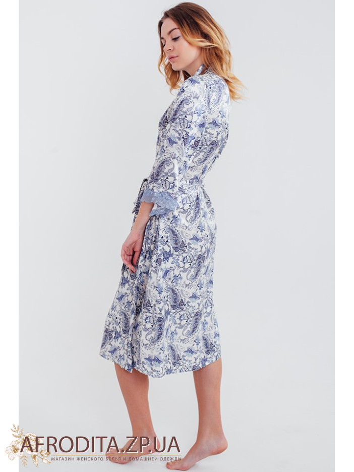 Шелковый женский халат "Дольче Вита" 5919 от Mia-amore. Халат ниже колен с оригинальным голубым принтом. Рукава обработаны голубым кружевом