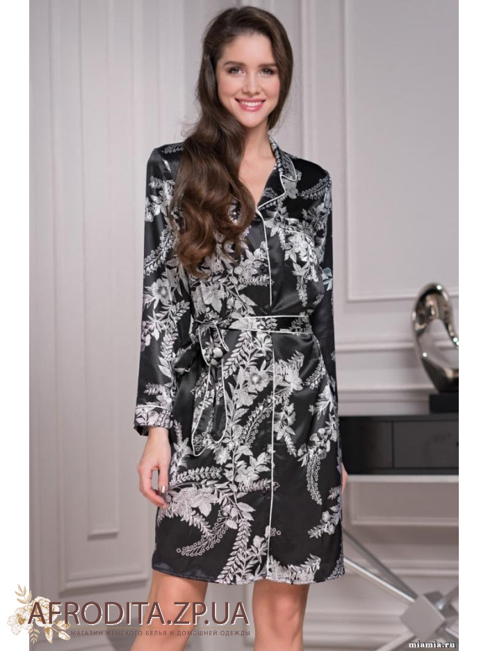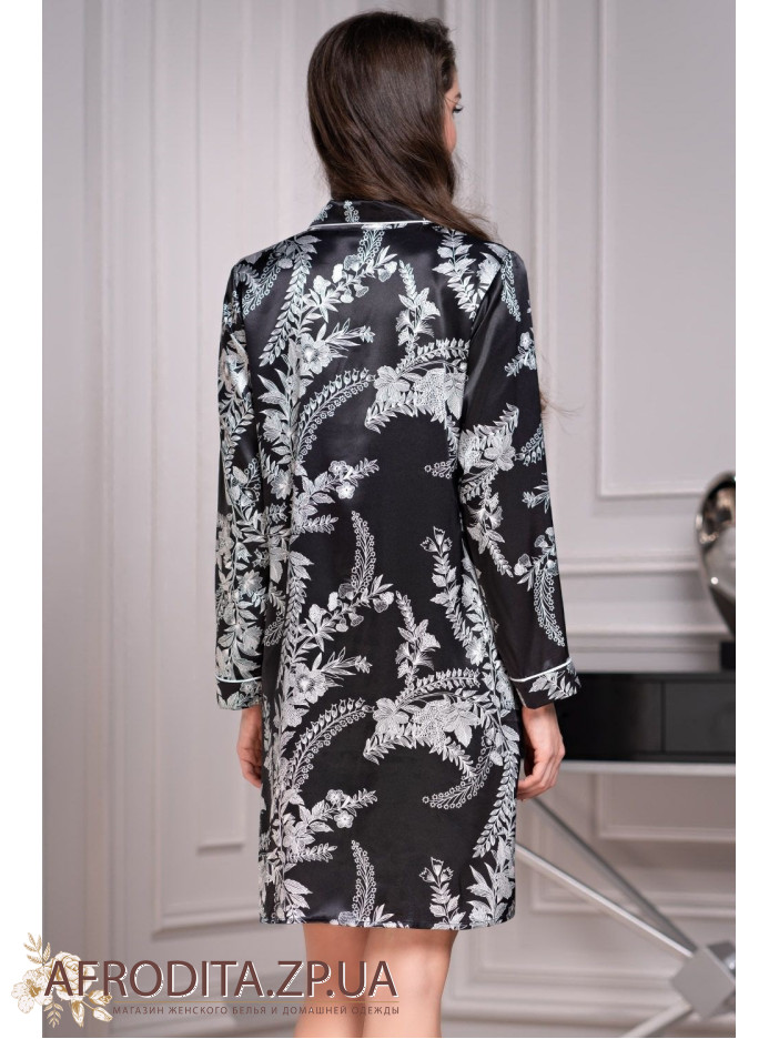 Удлиненная рубашка Mia-Amore с центральной застежкой на пуговицы выполнена из принтованного смесового шелка. Край борта рубашки, рукава и карманы декорированы контрастным тонким кантом.