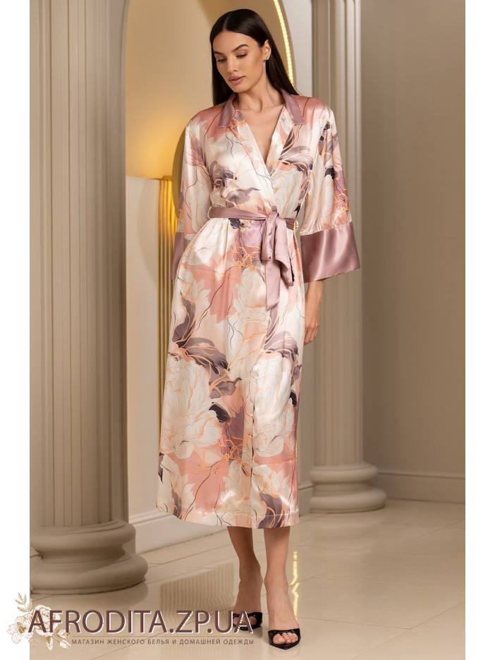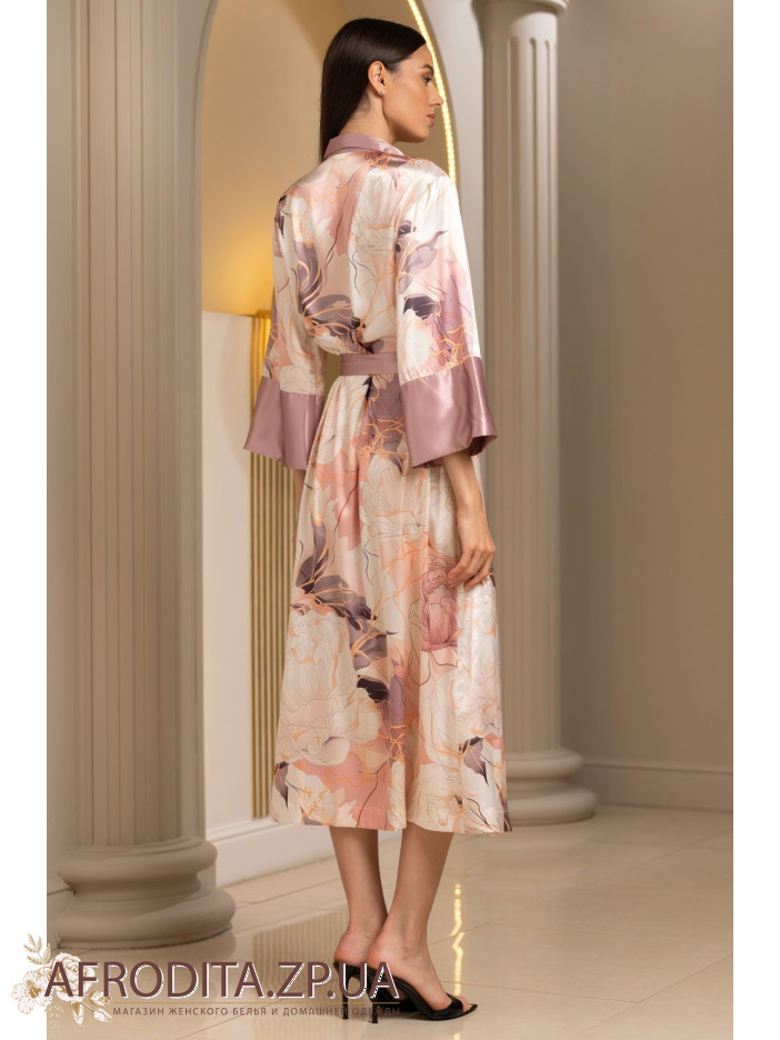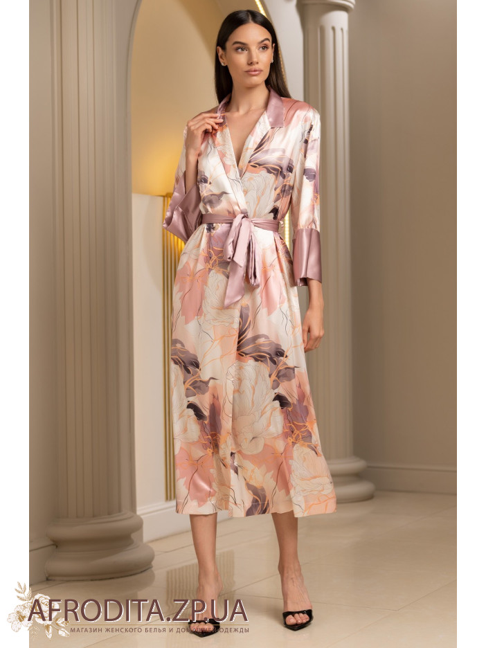 Длинный халат Пионы 4059 от Mia-Amore с рукавами длиной 7/8, застежкой на пуговицы и воротником-шалькой выполнен из принтованного смесового шелка. Воротник и низ рукавов декорирован однотонным шёлком. По талии ширина халата регулируется с помощью однотонного широкого пояса.