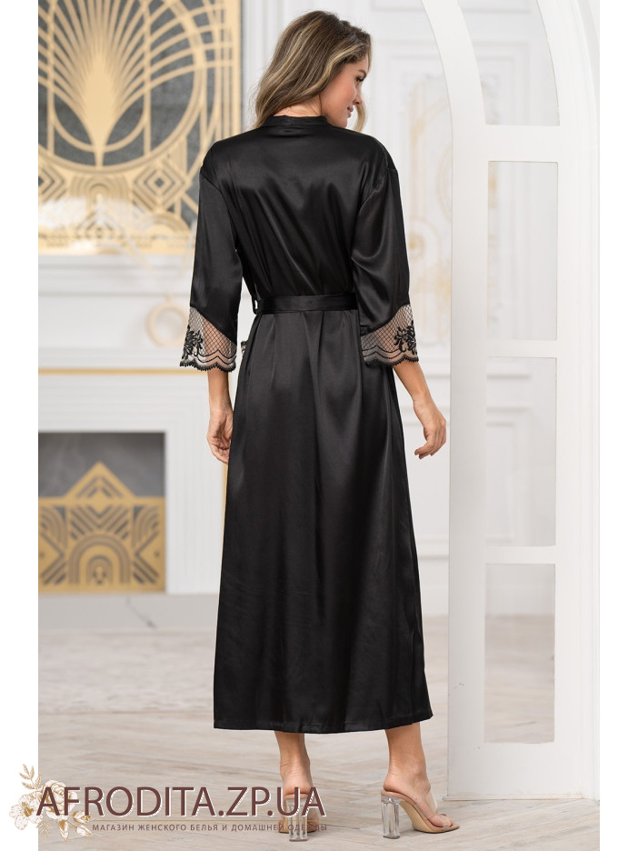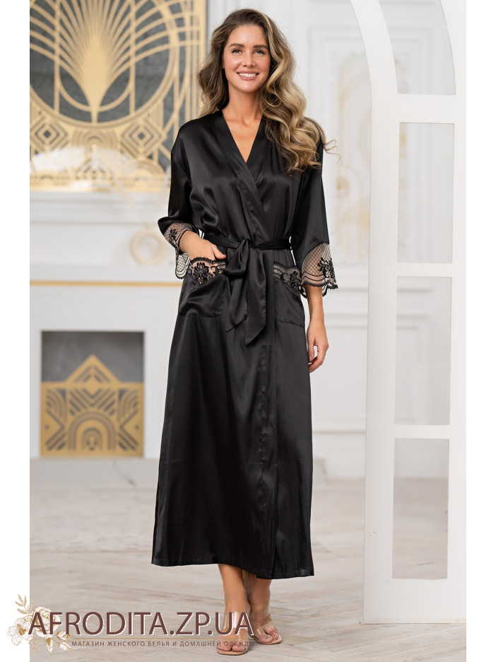 Длинный женский халат Реджина 3909 от Mia-Amore выполнен из смесового шёлка. Низ рукавов халата декорирован широким вышивным кружевом с фестонами и орнаментом. Халат запахивается с помощью широкого пояса. Спереди на халате накладные кармашки, декорированные также моновышивкой по сетке.