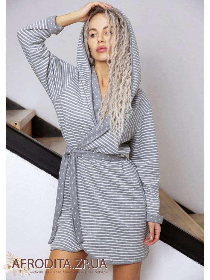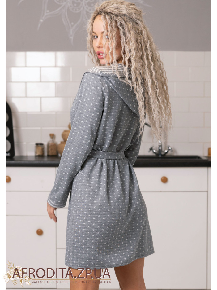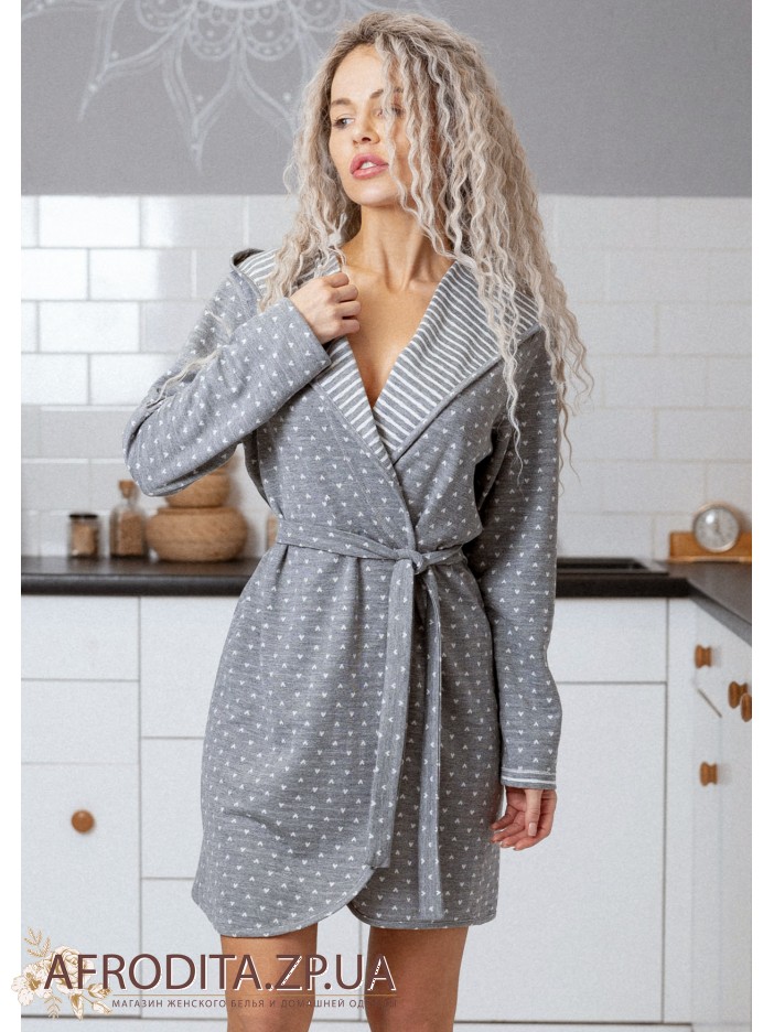 Двусторонний женский халат 1622-81004 с капюшоном изготовленный из мягкого хлопка. Халат на запах с длинным рукавом, в комплекте прилагается пояс.