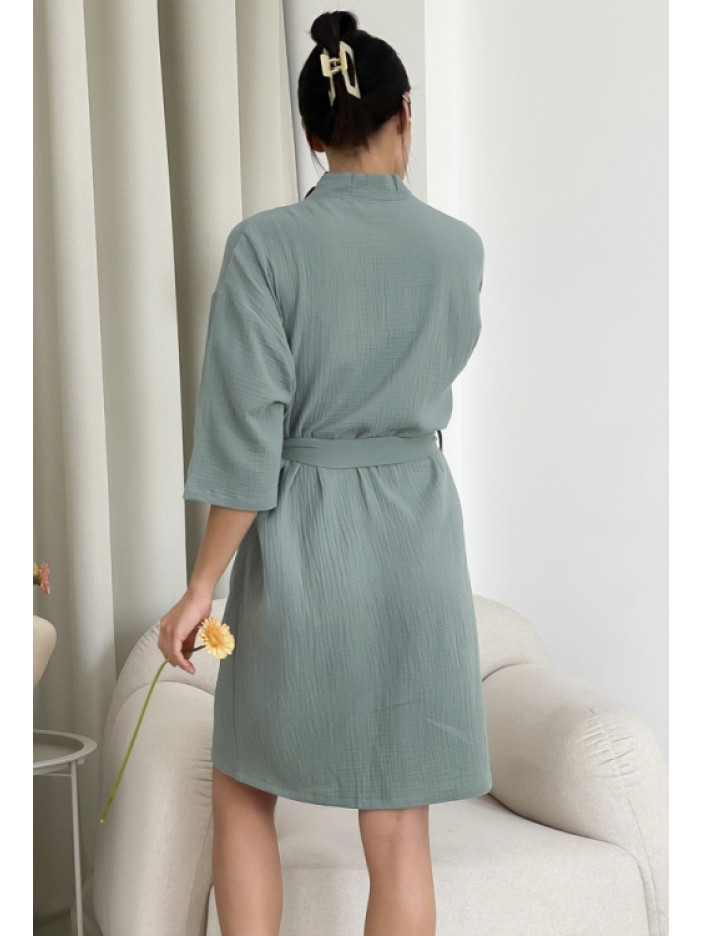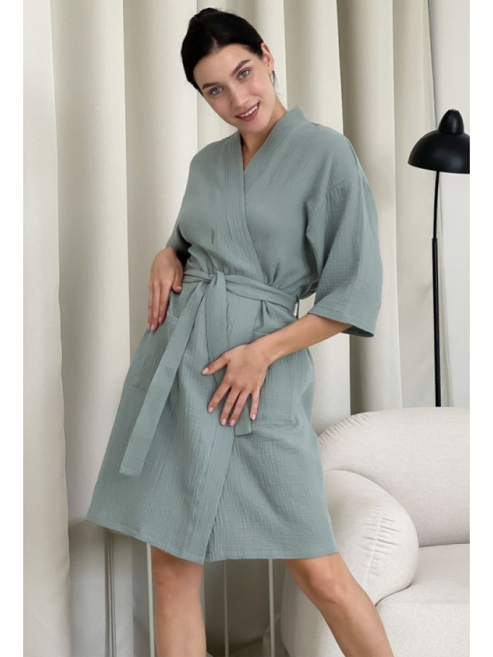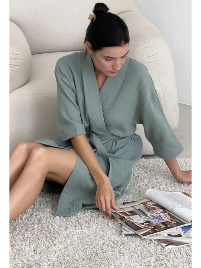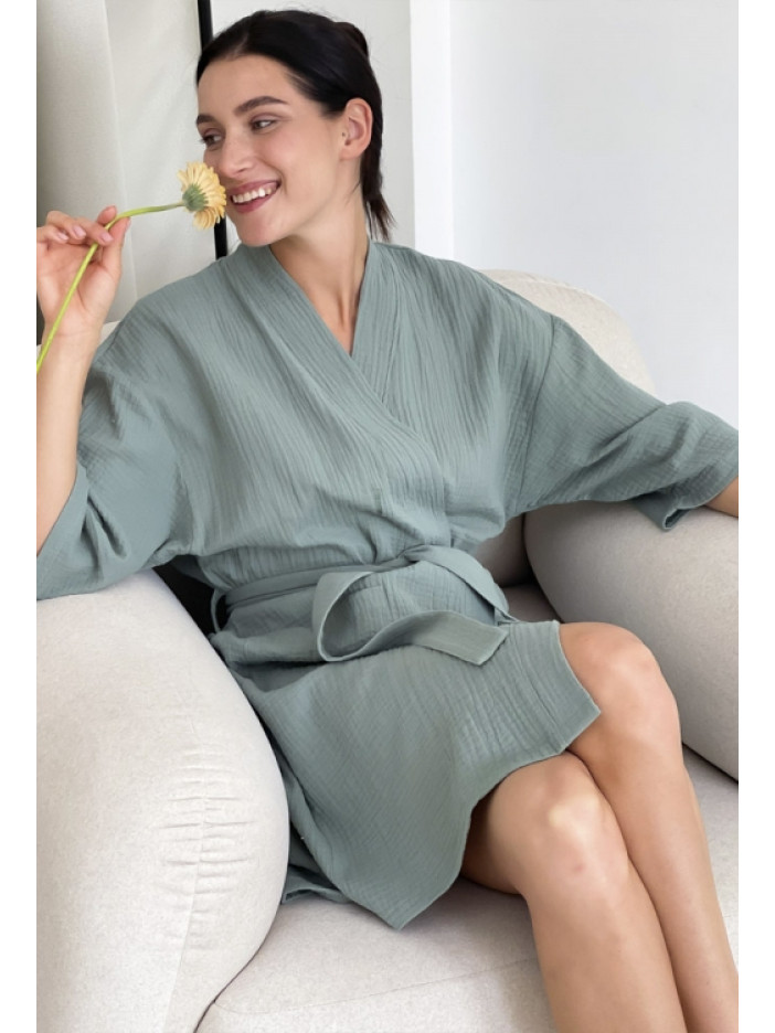 Воздушный женский халат от украинского бренда Cosy — стильная и комфортная модель для домашнего отдыха, выполнен из мягкого натурального хлопка глубокого тёмно-оливкового оттенка, который придаёт образу сдержанную элегантность, свободный силуэт с приспущенной линией плеча обеспечивает лёгкость и свободу движений, рукава 3/4 добавляют удобства в повседневной носке, длина выше колена делает модель практичной и универсальной, халат завязывается на запах с помощью пояса, а удобные накладные карманы по бокам добавляют функциональности, идеальный вариант для тёплого сезона и приятный подарок для близкого человека