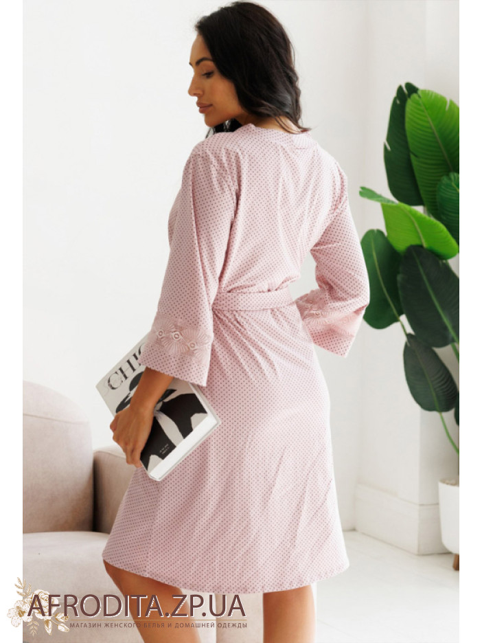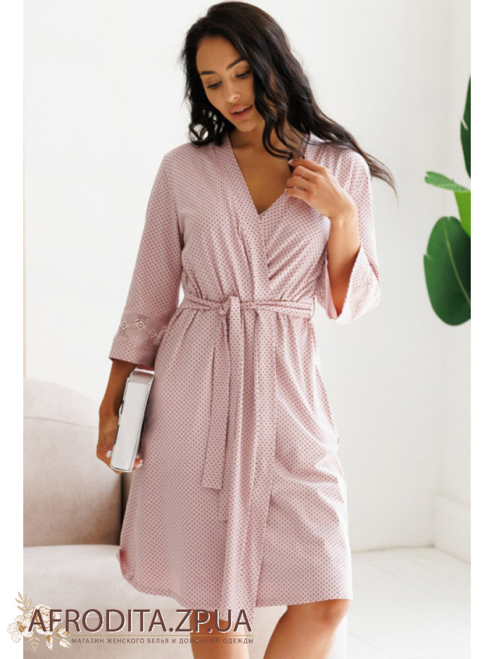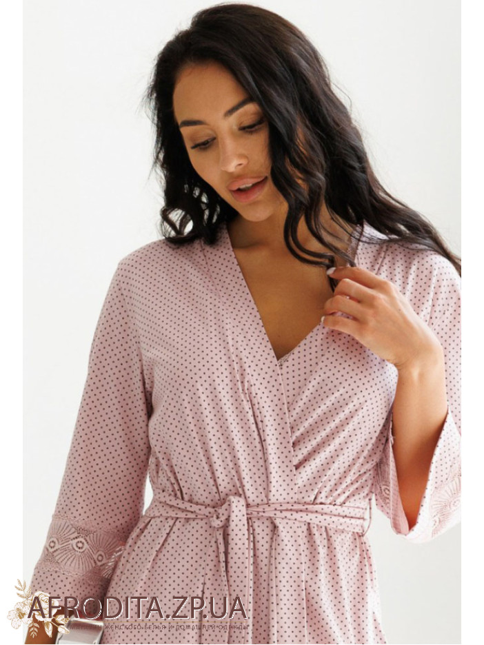 Женский халат Lila от украинского бренда Roksana — удобная и стильная модель для домашнего комфорта. Халат выполнен из мягкого, приятного к телу хлопка розового цвета с тёмно-серым гороховым принтом, имеет свободный силуэт, рукава 3/4 и длину выше колен. Завязывается на запах с помощью пояса, а вставки из ажурного кружева на рукавах добавляют образу изящности. Идеально подходит для утреннего и вечернего домашнего образа, а также станет прекрасным подарком близкому человеку.
