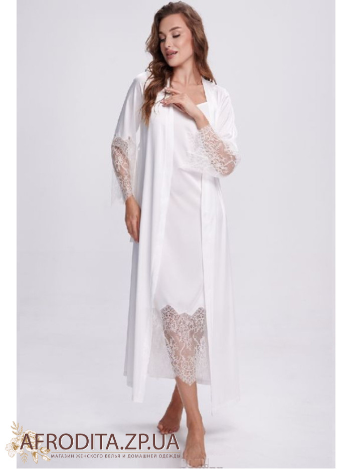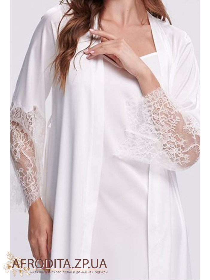 Элегантный женский халат Shato 2702/1 ecru из мягкого шелка Armani белого цвета – воплощение роскоши и изящества. Классический крой длиной в пол красиво подчеркивает силуэт, а запах с поясом обеспечивает комфортную посадку. Длинные рукава с широкими вставками из ажурного кружева придают образу особого шарма. Идеальный выбор для вечернего отдыха, утренних ритуалов и изысканный подарок.