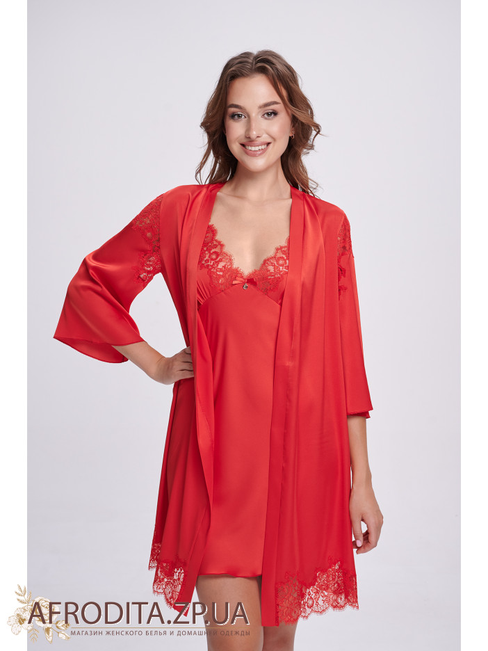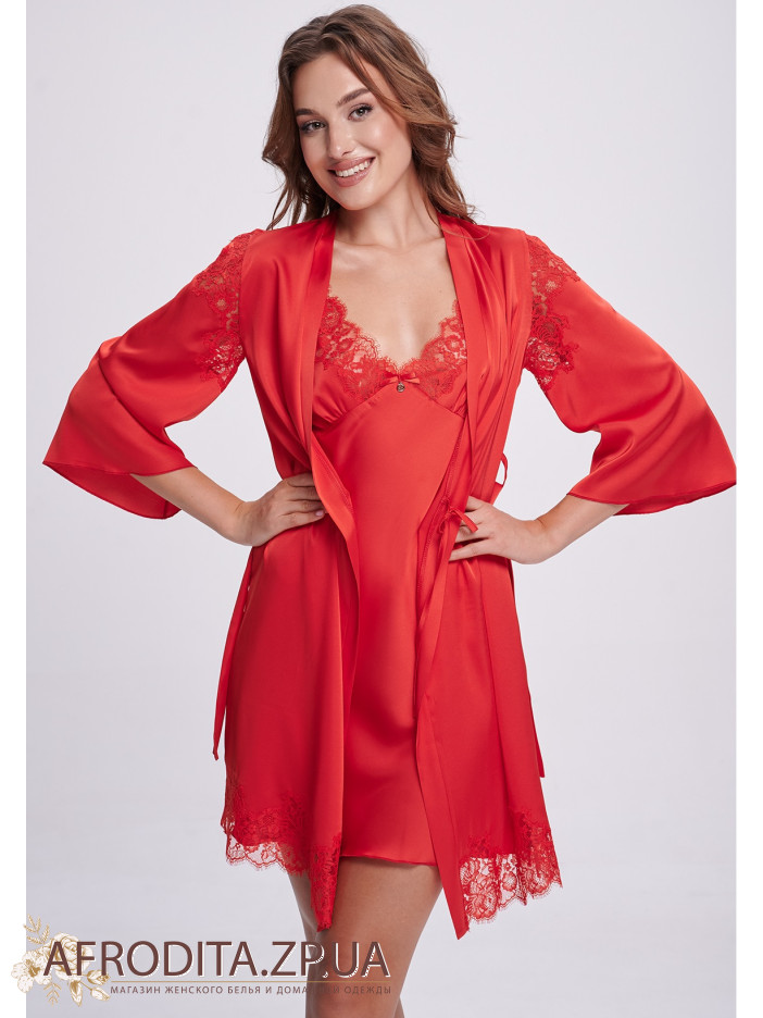 Женский халат Shato – изысканное дополнение к домашнему образу, сочетающее элегантность, женственность и комфорт. Модель выполнена из нежного, шелковистого шелка Armani насыщенного красного цвета, красиво струящегося и приятного к телу . Классический крой с запахом и поясом изящно подчеркивает талию, создавая соблазнительный силуэт. Легкие рукава длиной 3/4 украшены изысканным кружевом, что придает образу романтичности и утонченности. Длина выше колен делает халат удобным как для утренних ритуалов, так и для вечернего отдыха. Стильный, комфортный и невероятно женственный этот халат станет идеальным дополнением к ночной рубашке и роскошным подарком для любимого человека.