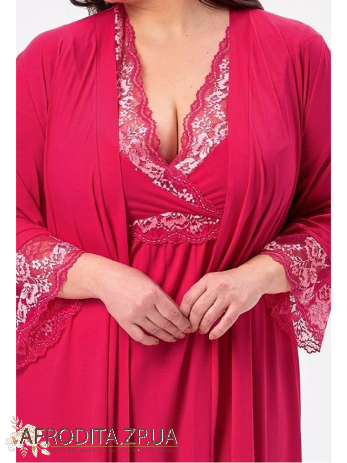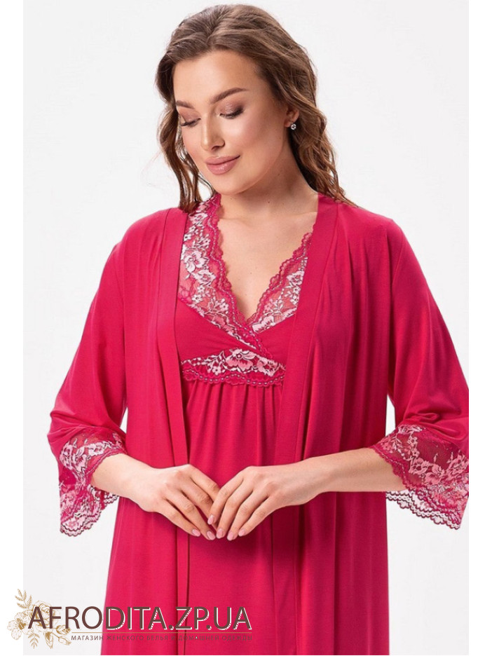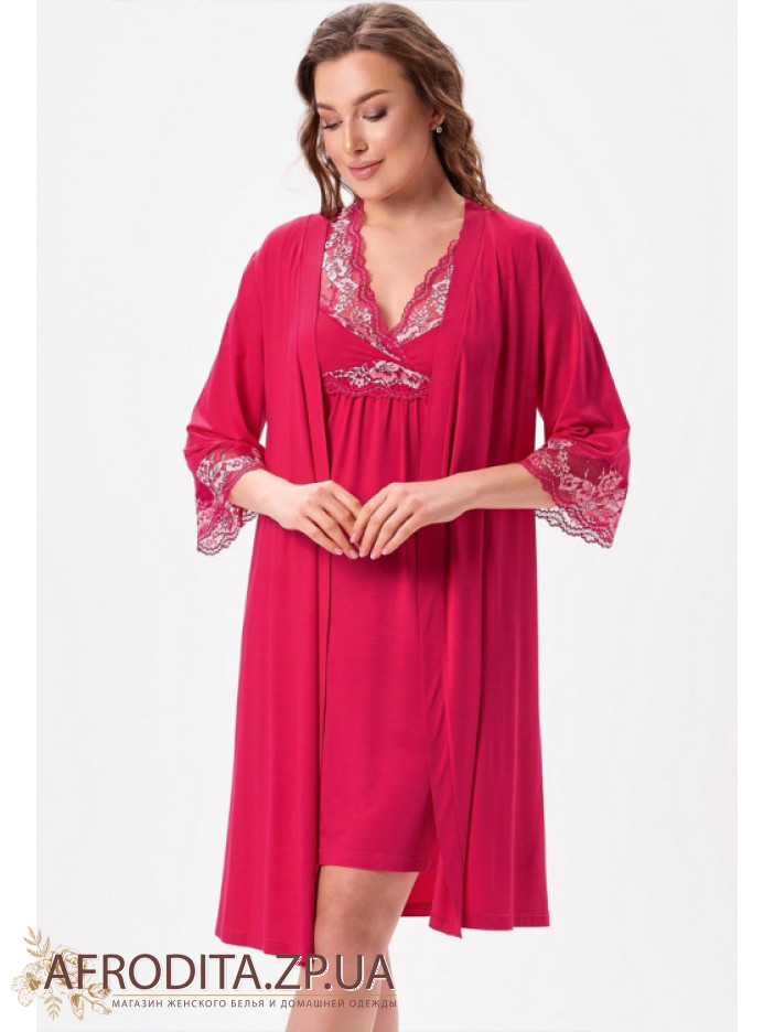 Элегантный женский халат Shato 2625/1 малиновый из мягкой малиновой вискозы — идеальное сочетание комфорта и утончённого стиля. Классический крой с рукавами 3/4 и длиной чуть выше колен обеспечивает удобство, а запах с поясом красиво подчёркивает талию. Нежные ажурные вставки на рукавах придают образу женственность. Прекрасный вариант для дома и изысканный подарок для близкого человека.