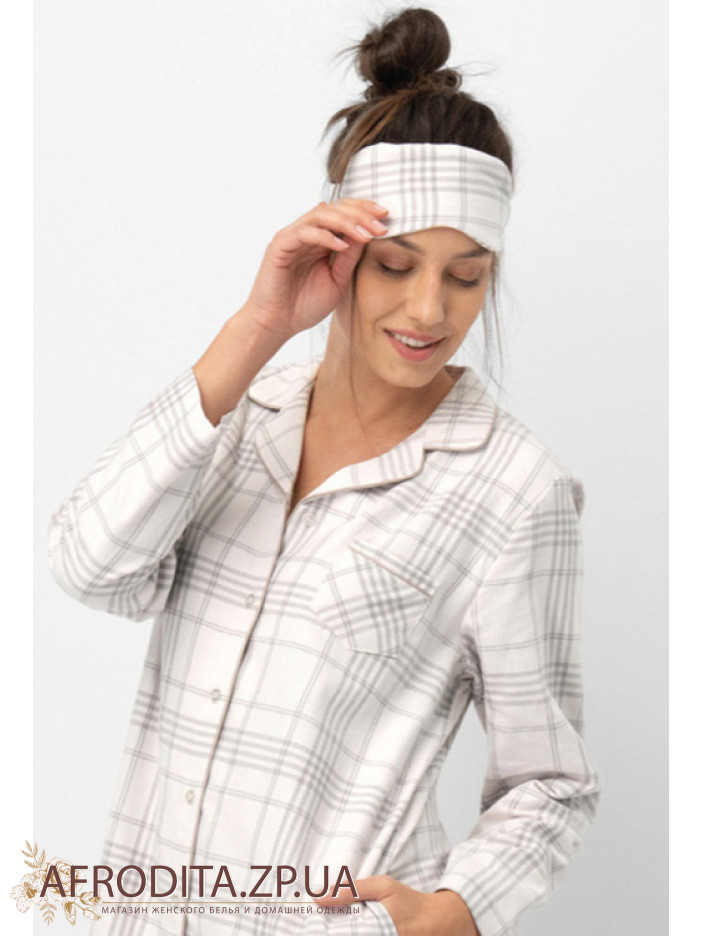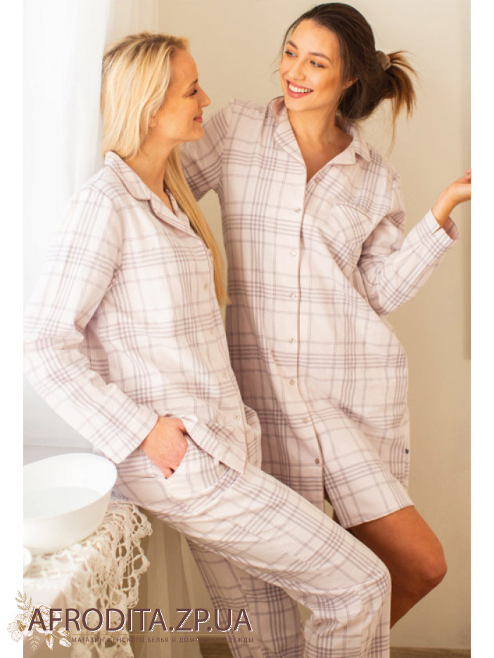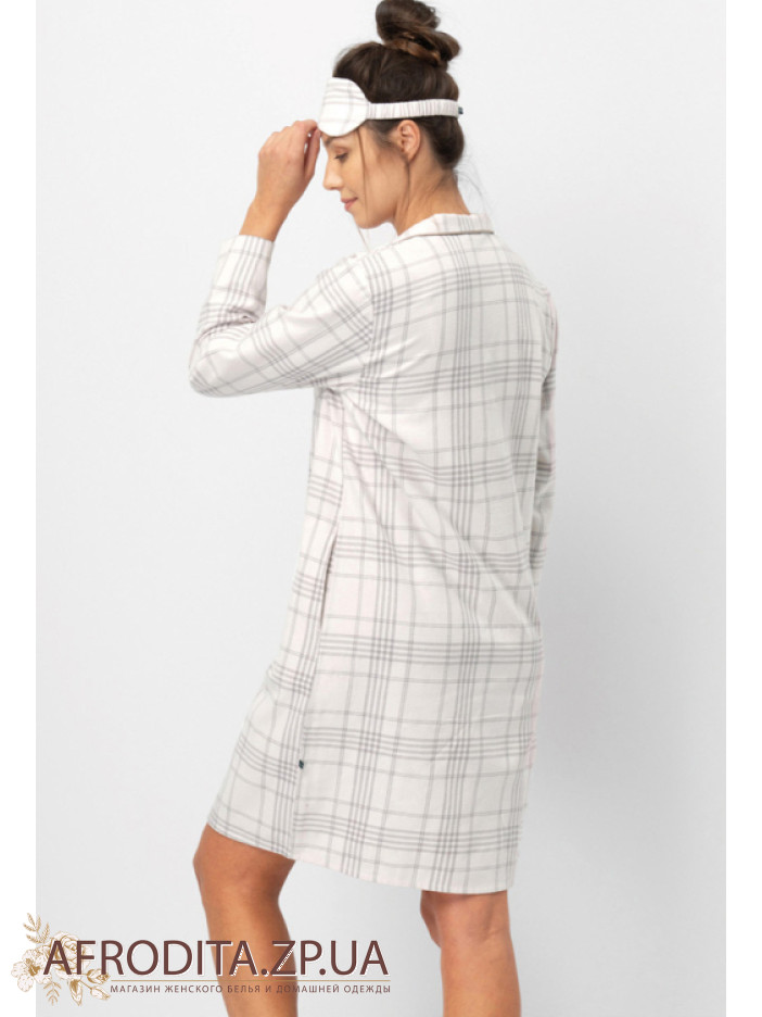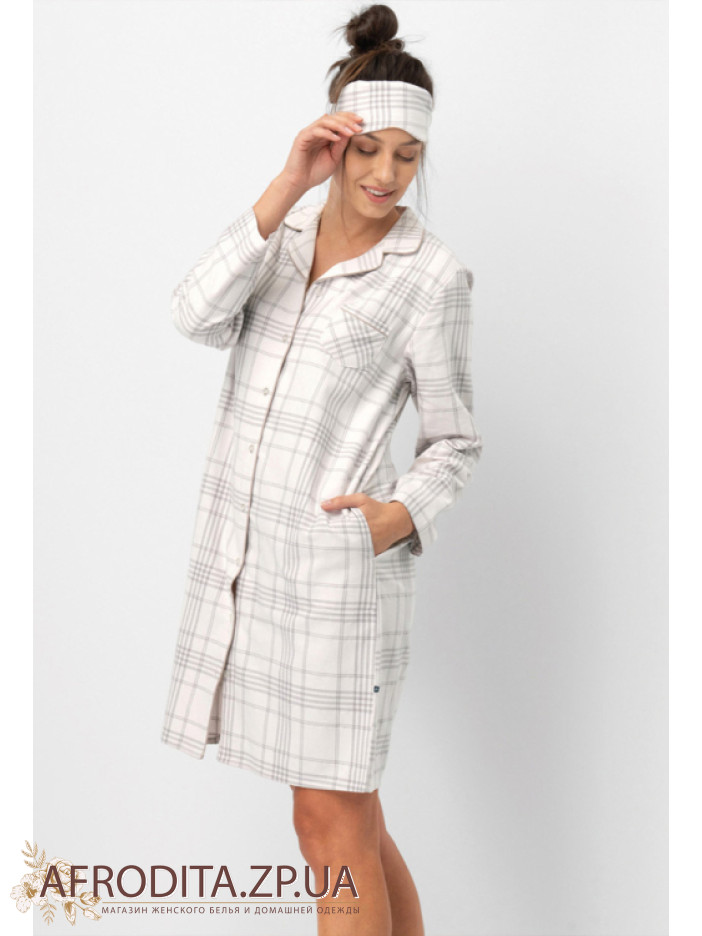 Женская рубашка-халат в клетчатый принт LND 401 B25 от польского бренда Key из мягкой фланели. Модель выше колен с длинными рукавами и застегивается на пуговицы. На груди слева в качестве декора расположен накладной карманчик. По бокам изделия расположены карманы.