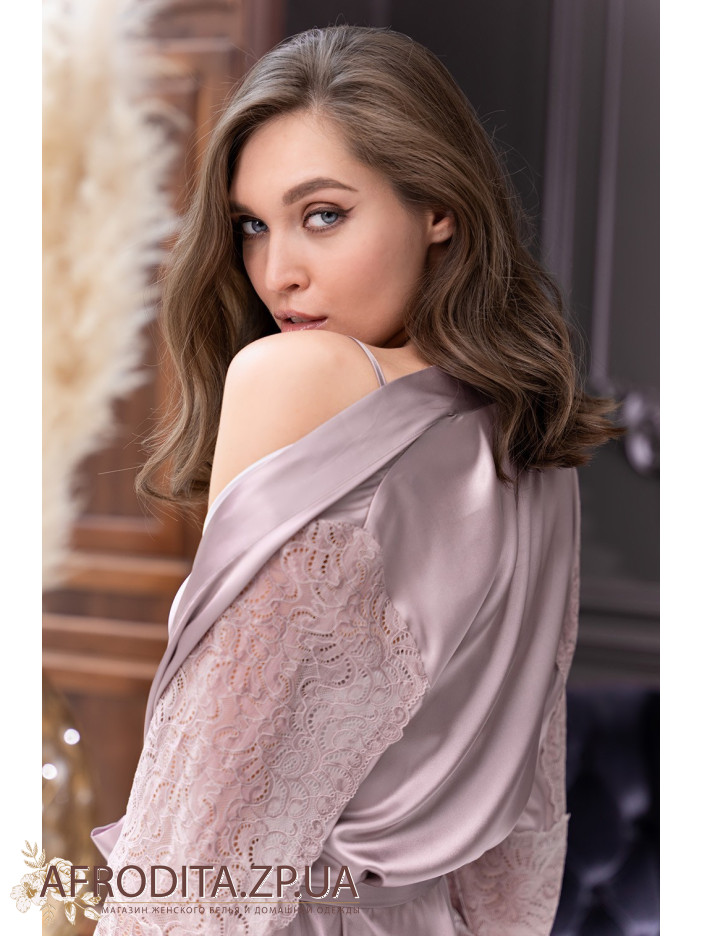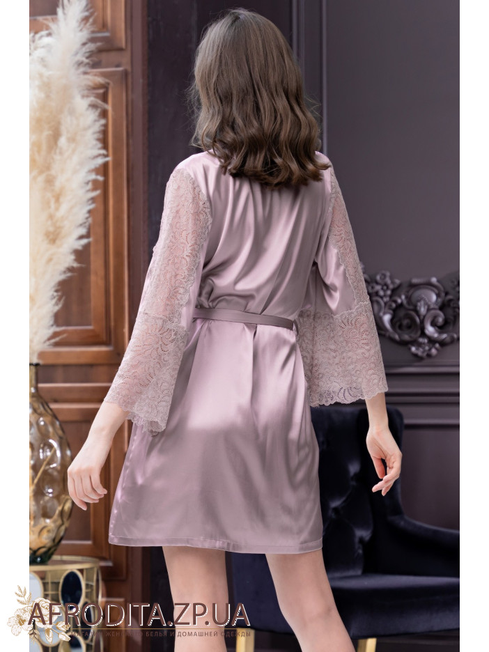 Короткий запашной халат Мисти 7263 от Mia-Amore с широкими кружевными рукавами длиной ¾. Халат выполнен из однотонного искусственного шелка. В боковых швах расположены карманы. Линия талии подчеркивается за счет широкого пояса с кружевными вставками на концах.