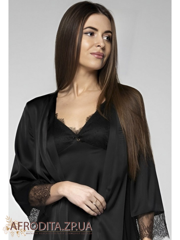 Женский атласный халат Shato 2210/1 изготовленный из мягкого шелка Армани. Модель выше колен с рукавами 3/4, края которых украшены ажурным кружевом в тон изделия. Халат на запах, линия талии регулируется поясом.